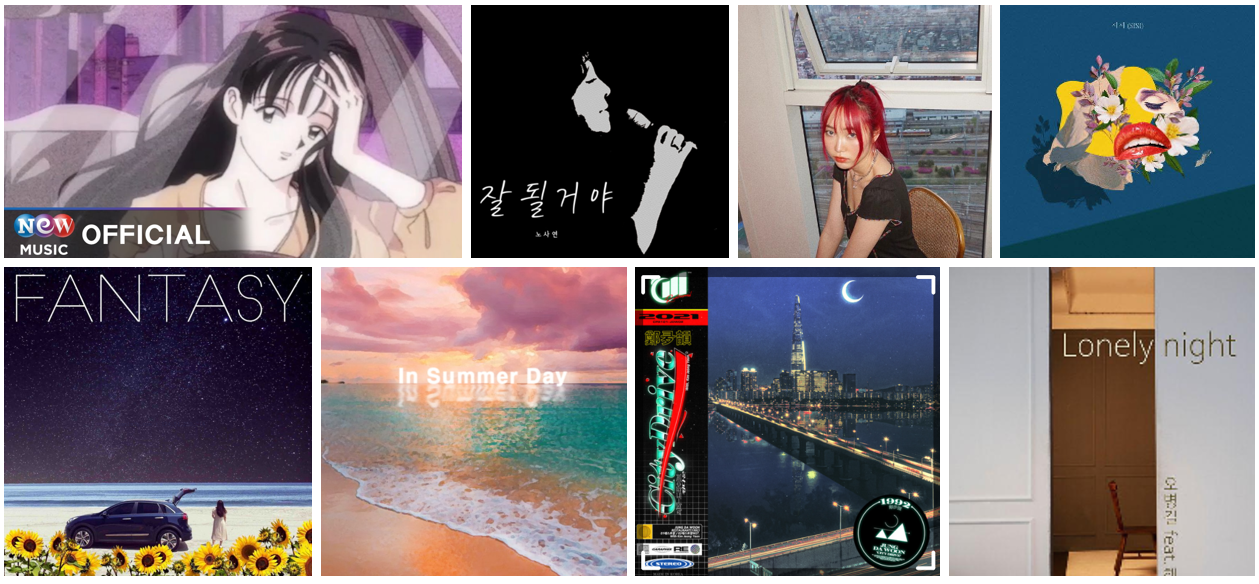 여름 시즌이라 그런지 시티팝 사운드들이 많이 나왔다. 위 김현철의 컴백도 있었지만 1989년 '만남'으로 대한민국을 흔들었던 선임 가수 노사연의 시티팝 컴백도 눈에 띄었다. 위 이미지 좌상 단부터 시계방향으로 '메모리 시트' - 그네, 최수빈, '잘 될 거야' - 노사연, '밤바다의 파도보다 더 높게' - 와일드베리, '시시' - 수코지, 'Fantasy' - 비트크림, 'In summer day' - 문연, '레스토랑' - 정다운, 김정연, 'Lonely Night' - 오병길인데, 거의 다 청량한 느낌의 곡들이지만 오병길의 'Lonely night'은 딥한 가성의 소울 보컬이 감미로우면서도 강렬한 미드나잇 그루브스러운 사운드로 상당히 매력적이다.