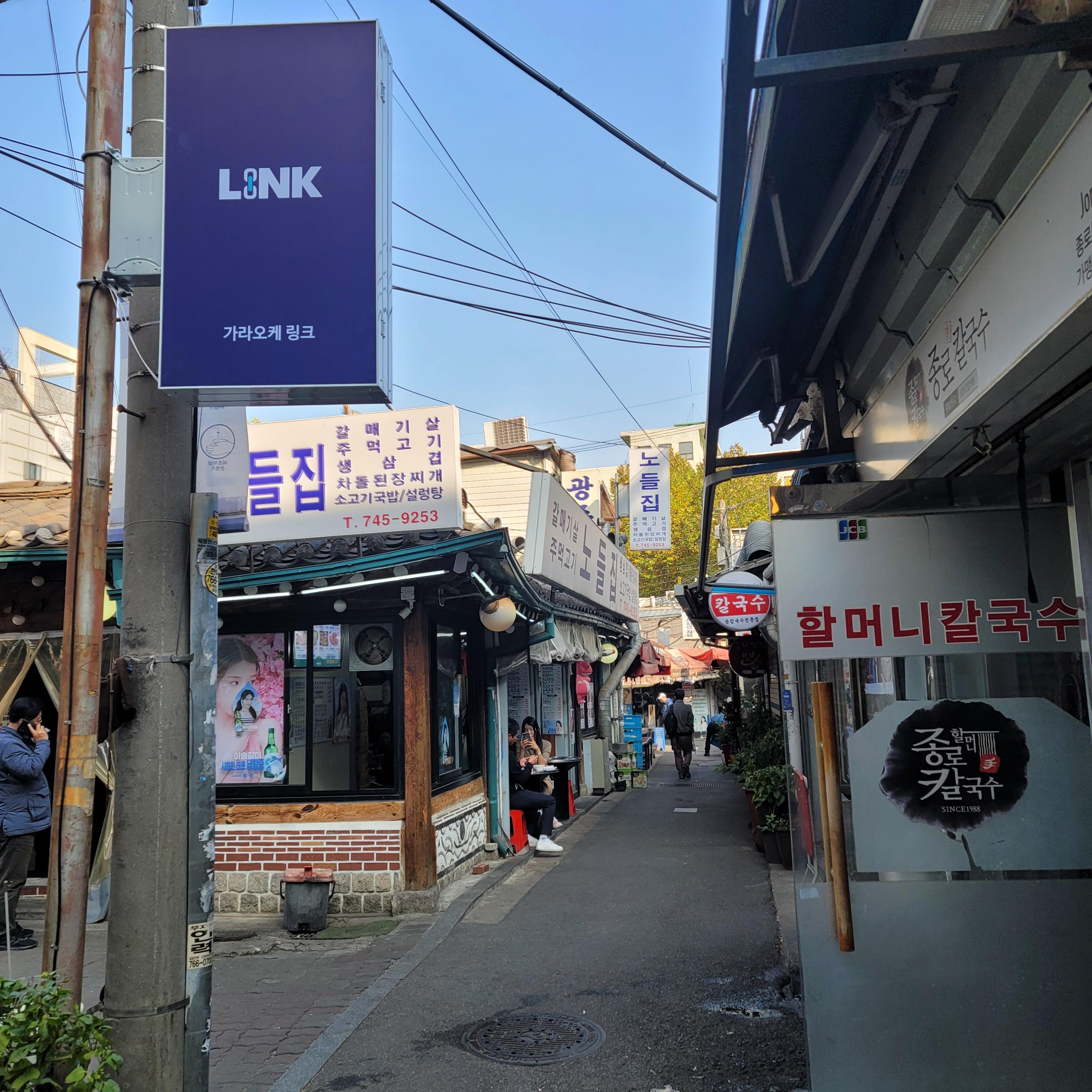종묘 가는 길. 저 우측 사이드 중간중간 어르신들을 위한 술집들이 있는데 낯부터 막걸리 '한 잔'을 몇 백 원 수준에 마실 수 있다. (지금은 물가 땜에 가격이 더 올랐는지는 모르겠다)