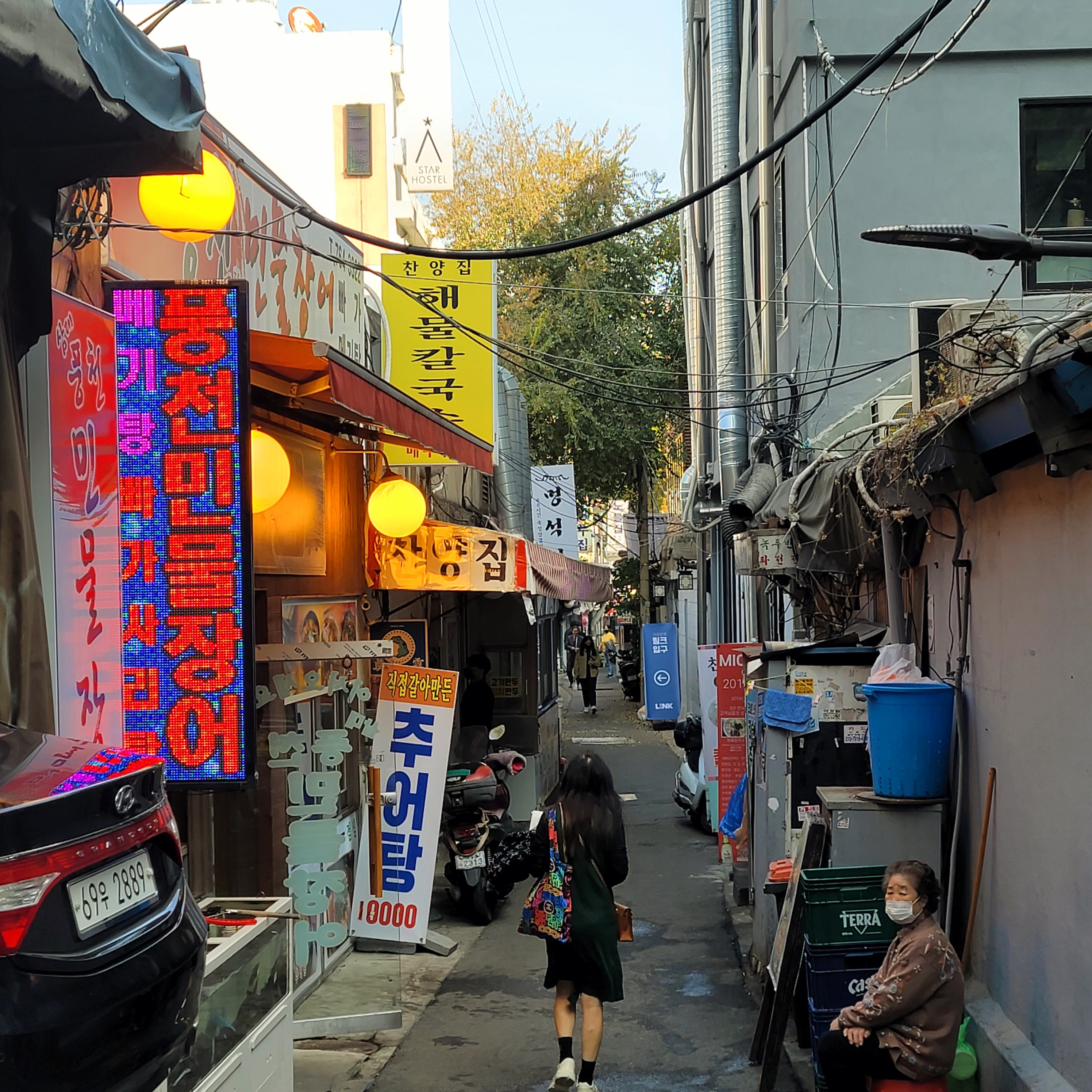 이곳이 밤엔 옛날 포장마차 거리로 싹 변하던데 진짜 사람이 들어갈 틈이 없을 정도로 포장마차 마차마다 꽉 차 있는 것에 나름 신선한 문화 충격을 받았다.