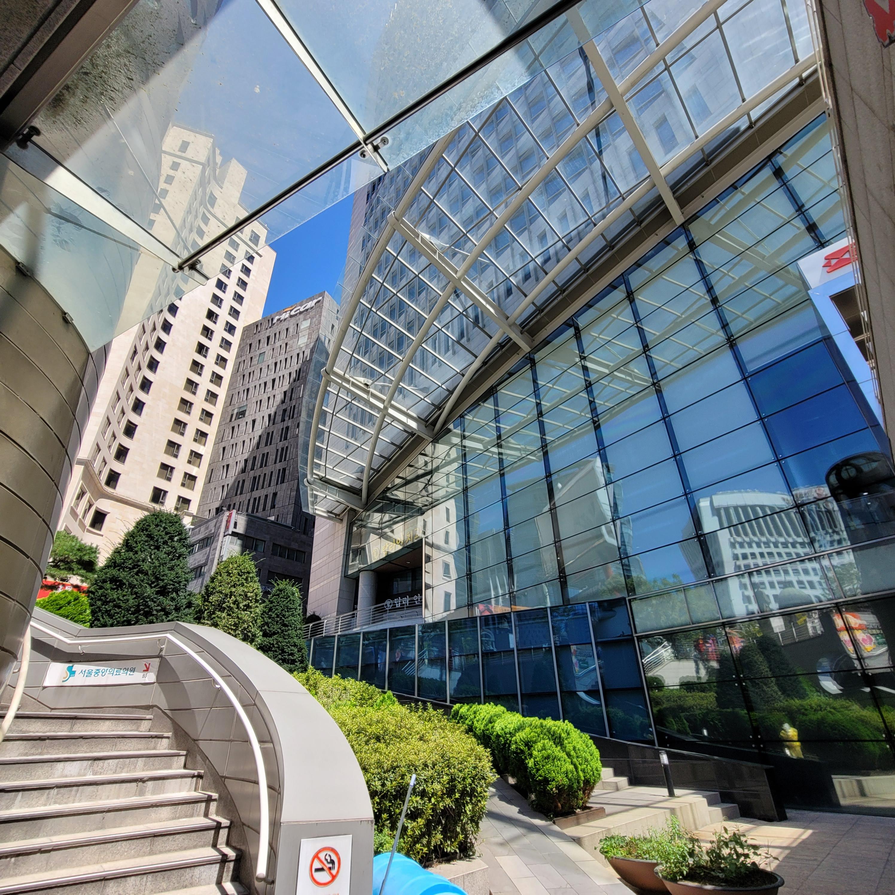 흡연장소에서 좌측을 돌아보면 대각선으로 시그니쳐타워와 바로 옆에 삼일빌딩이 보인다. 한화, 미래에셋, 시그니쳐타워의 최신식 디자인에 밀려 눈에 잘 안 들어 올 수도 있는 삼일빌딩은 사실 이 터의 터줏대감 중 하나다. 1970년에 완공될 당시 서울에서 가장 높은 건물로서 그 위용을 자랑했고 (31층이라서 삼일빌딩이다), 이를 지은 김중업 건축가는 김수근과 함께 대한민국 근현대 건축사를 대표한다. 어떻게 보면 동시대 최고의 건축가들로서 라이벌 구도가 그려질 수도 있는데 둘의 운명은 그 이상으로 희비가 갈린다
