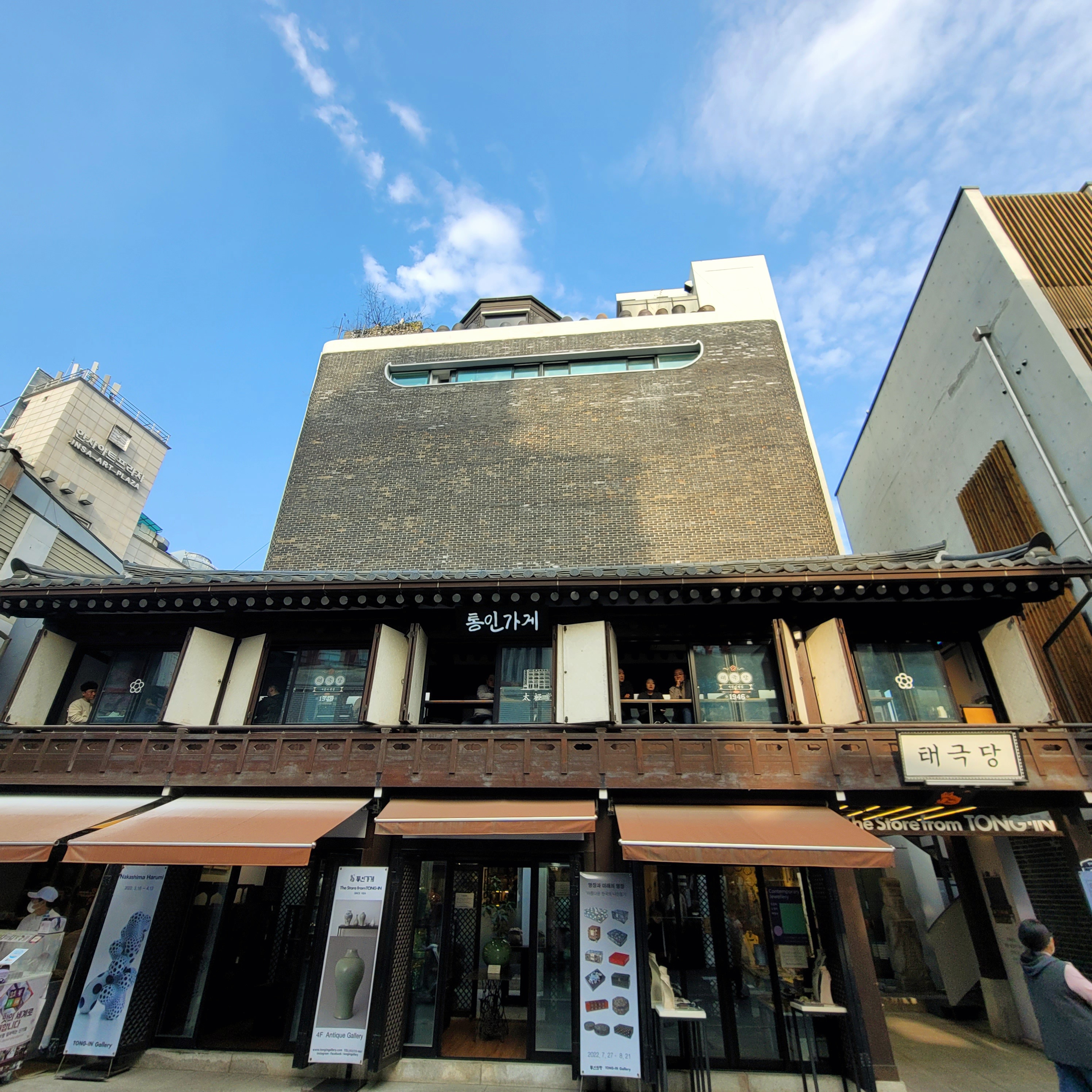 그 에코 건물 옆에 눈을 끄는 또 하나의 건물. 저 라인형 스킨 때문에 그런지 옛 김수근 후기 건축이 생각나기도 하는데, 그것과는 별개로 저 건물은 인사동 건물들 특유의 한국 문화와 어울리는 인사동 아이덴티티에 더 충실한 것 같다. 비슷하긴 하지만 비교하기엔 김수근 후기의 저 라인 형태는 너무 모던하긴 하다. 참 맘에 드는 건물 두 개다. 요즘 말로 하면 예쁜 애 옆에 예쁜 애? 그런 느낌