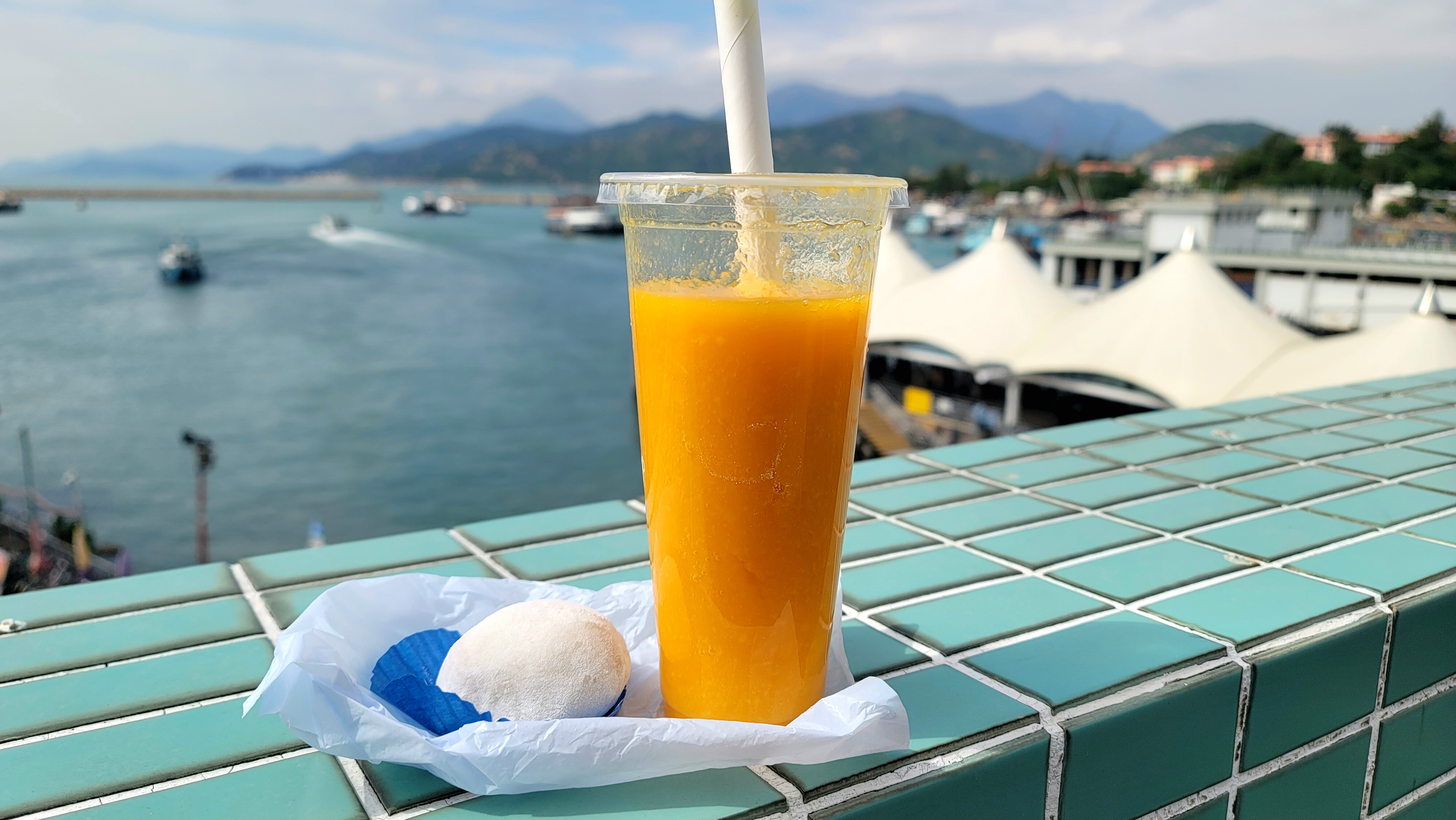 콩맛 모찌 1개 + 망고 주스를 주문. 그리고 숙소에 돌아와 발코니에서 선착장 뷰 즐기며 먹음.