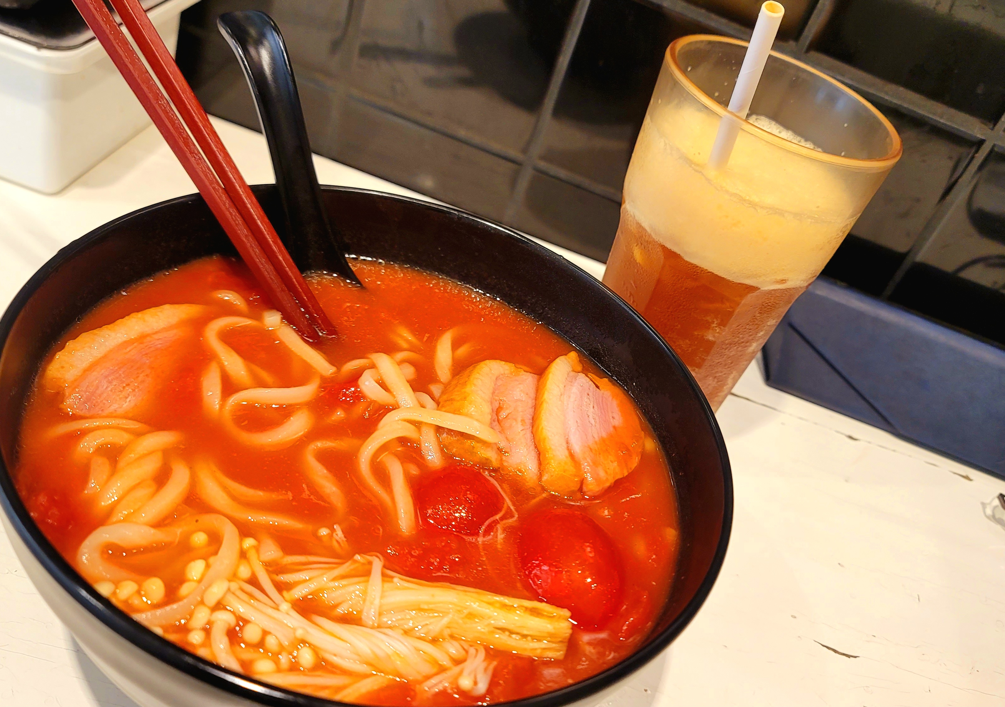 - 홍콩식 토마토 육수 + 우동면 + 오리가슴살 토핑 조합으로 주문.