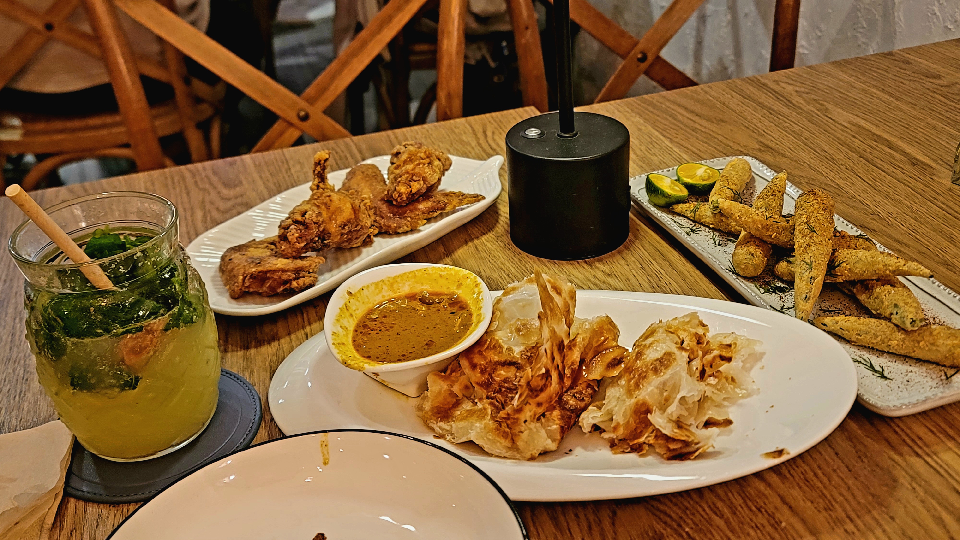 Rotti Prata with Curry(중앙)가 제일 맛있었다. 막 구운 로티의 결과 식감이 훌륭하고 카레도 중독성 있는 맛이다. 오크라(오른쪽) 특유의 아삭한 식감이 튀김과 잘 어울린다. 벨라칸 후라이드 치킨윙(상단), 말레이식 치킨인데 솔직히 한국 치킨 압승. 그리고 시그니처라는 Calamansi & Salted Plums Soda(좌측)는 살짝 삭막하고 드라이해 보이는 접시들을 상큼하게 쓸어내리는 역할 했다.