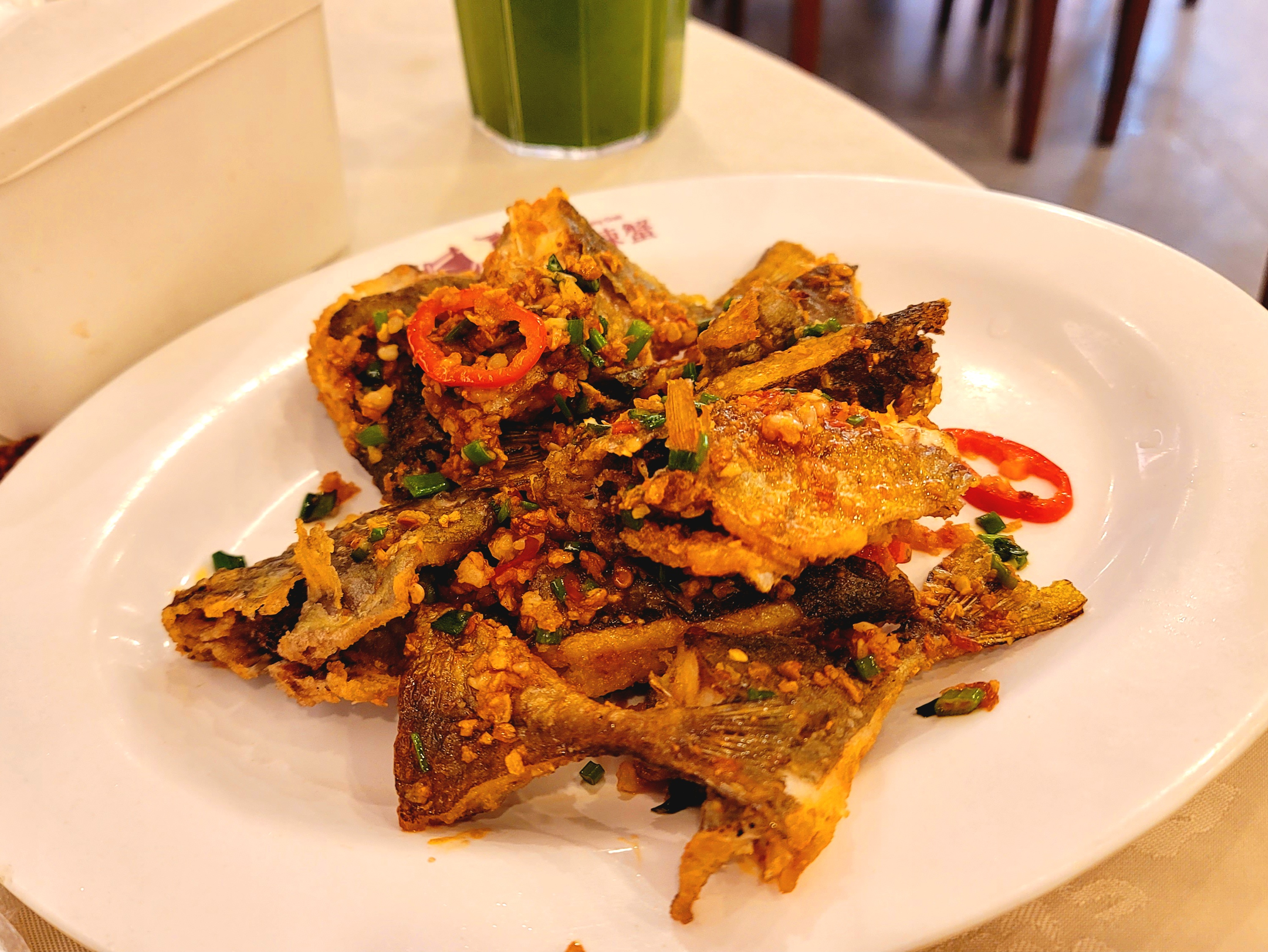 황어 튀김 (干炸小黃魚). 조기 비슷한 황어 튀김. 바삭한 겉과 촉촉한 속, 튀김과 구이 사이 어딘가의 식감인데 애매하지 않고 존재감 확실했다.