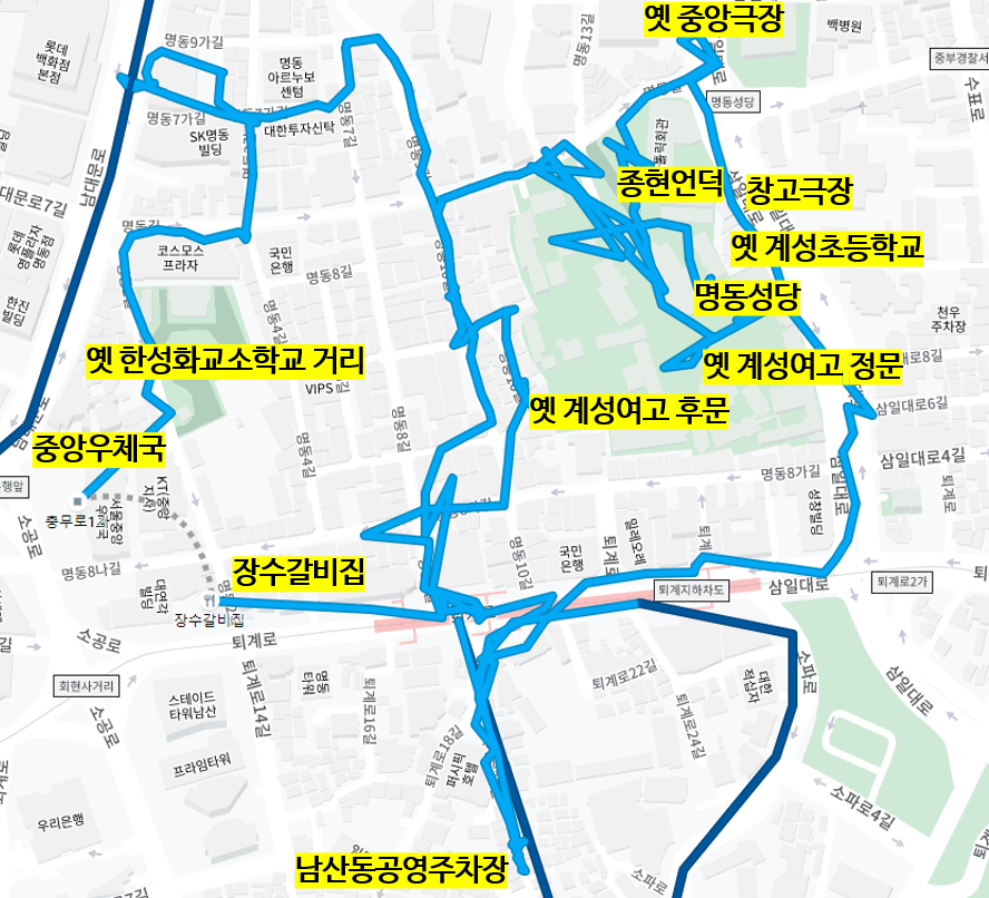 추억팔이로 돈 명동, 만보기 보니 한 8000 걸음 걸었다. 주차장 > 세종호텔 > 옛 계성초교후문 (창고극장) 오르막 > 옛 중앙극장 > 명동성당 > 샛별동산 > 옛 계성초 > 옛 계성여고 정문 > 장수갈비 > 옛한성화교소학교거리 > 중앙우체국 (스벅과 우편 박물관) > 옛 계성여고 후문 루트로 돌았다
