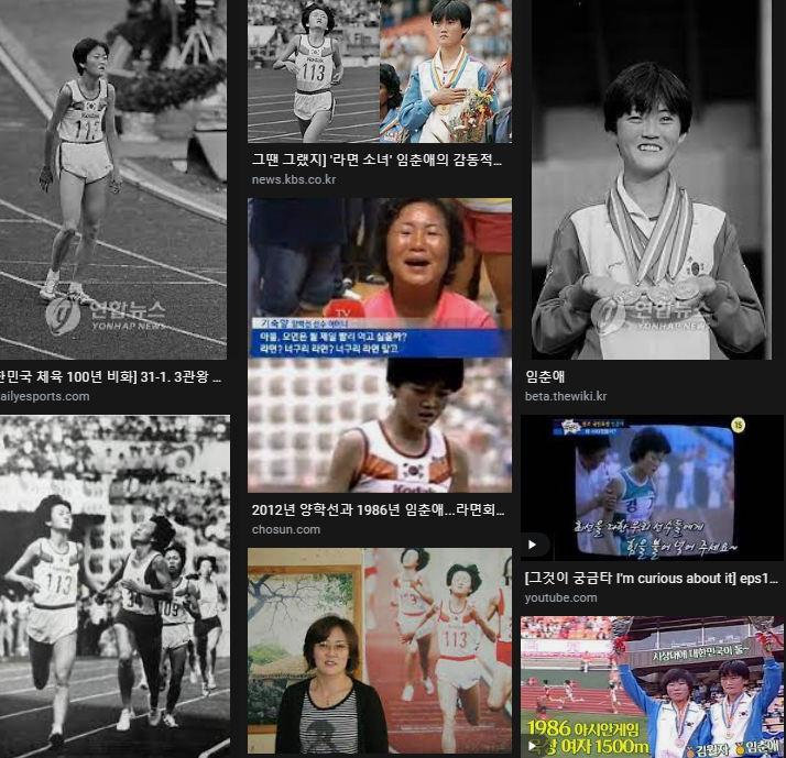 달려라 하니 하면 뭐니 뭐니 해도 오버랩될 수밖에 없는 인물이 1986년 서울 아시안 게임 육상의 주역, 라면만 먹고 뛴 소녀 17세 소녀, 임춘애! 다. 박찬호, 김병현, 손흥민 등 이전 힘들던 80년대 온 국민에게 짜릿한 전율과 순수한 감동의 희망과 용기의 기억을 선사해준 선수였다