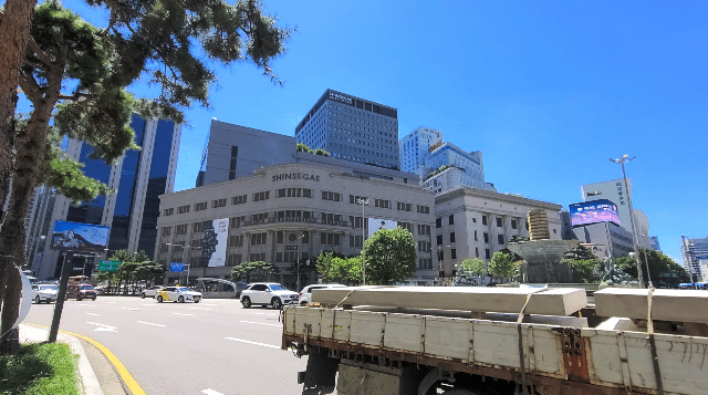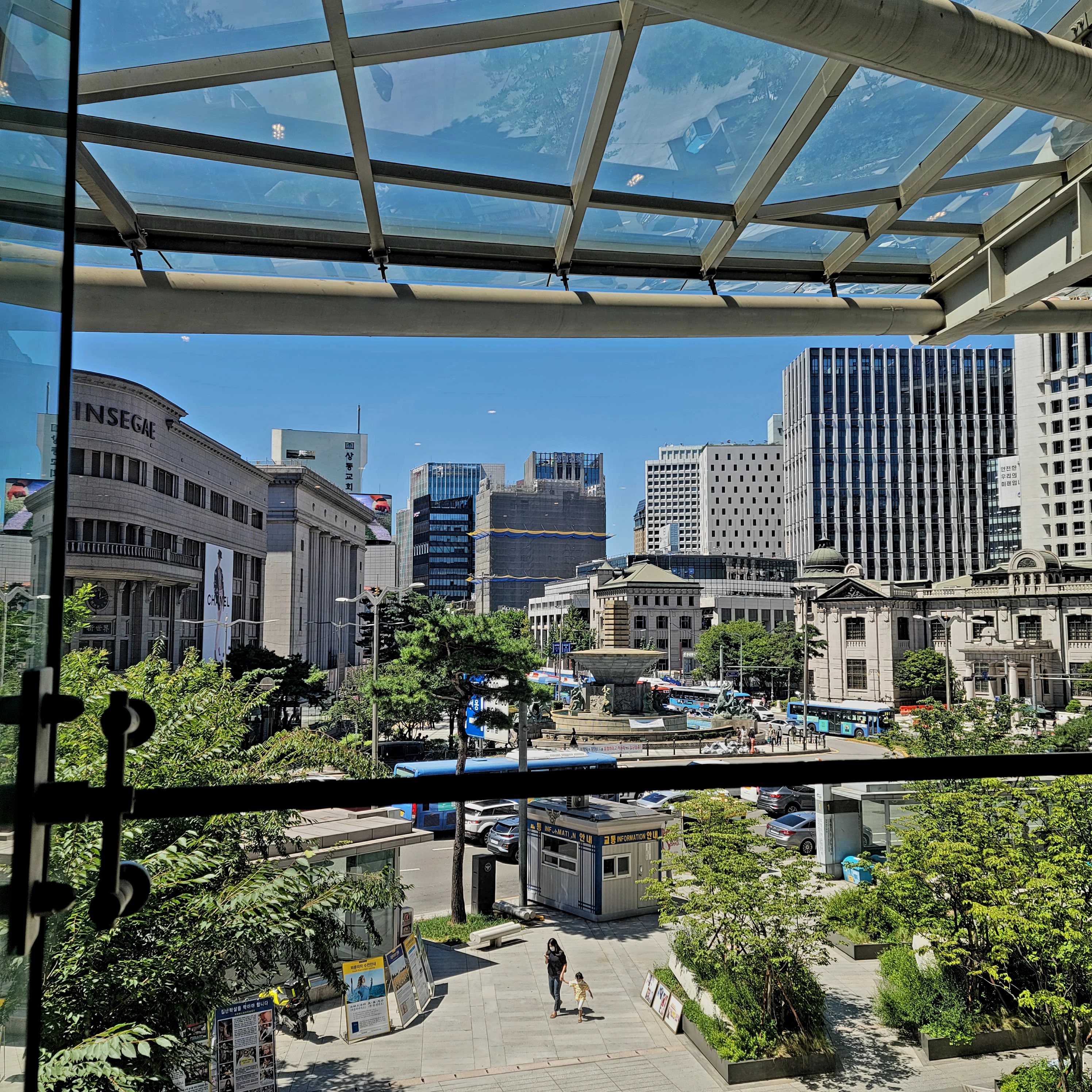 말이 2층이지 계단을 좀 올라가야 하는데, 스벅 2층의 뷰는 서울 역사의 중요한 스폿을 포인팅 하고 있다. 일제강점기 때부터 그 모양을 그대로 간직하고 있는 신세계와 한국은행이 바로 그것이다