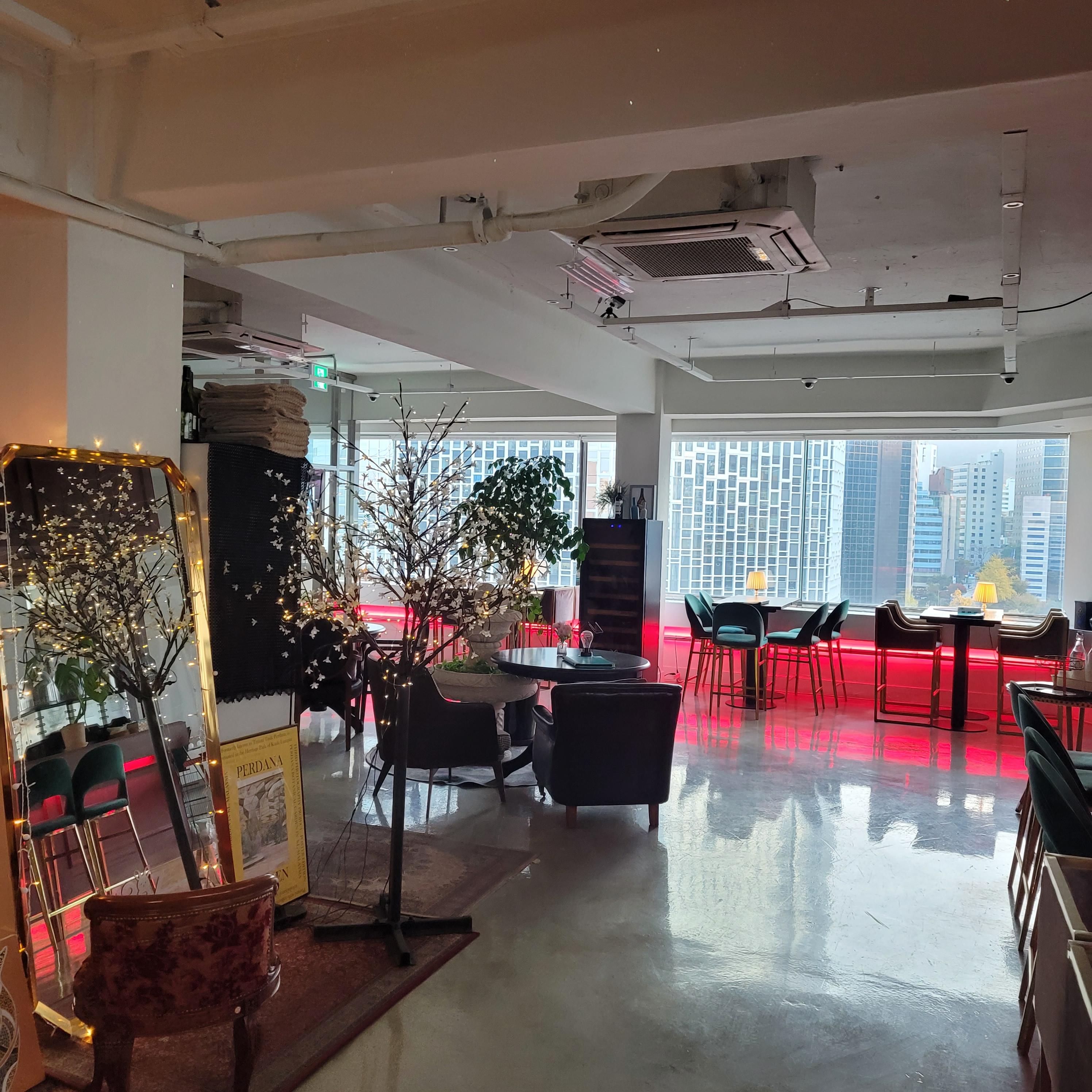 10층의 Bar 공간, 여기도 역시 저녁이 되니 훨씬 예뻐진다. 날씨 때문에 비닐막이 쓰인 루프탑의 매력은 약간 떨어지는데 오히려 아래층 공간이 훨씬 분위기가 좋아 보이기도 한다