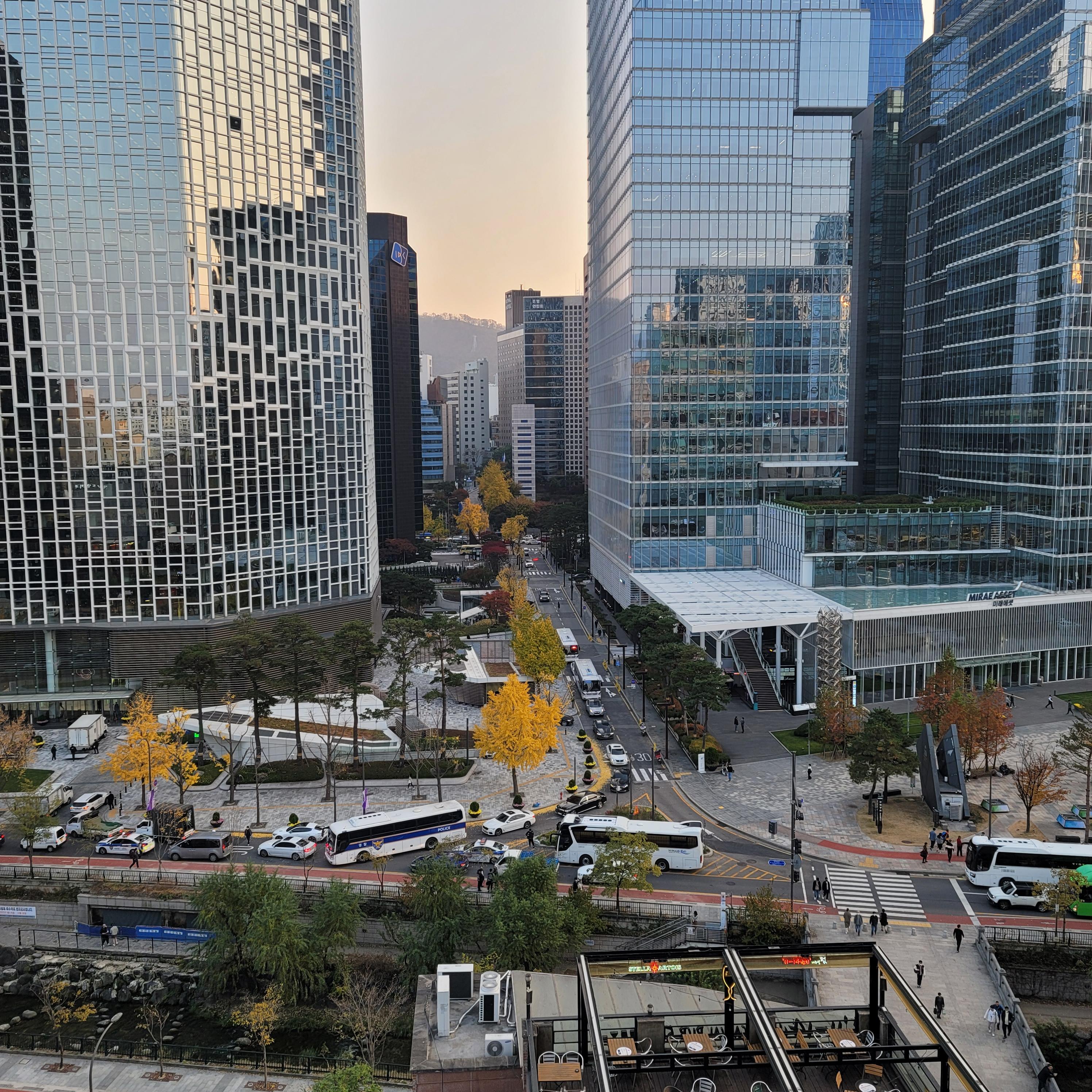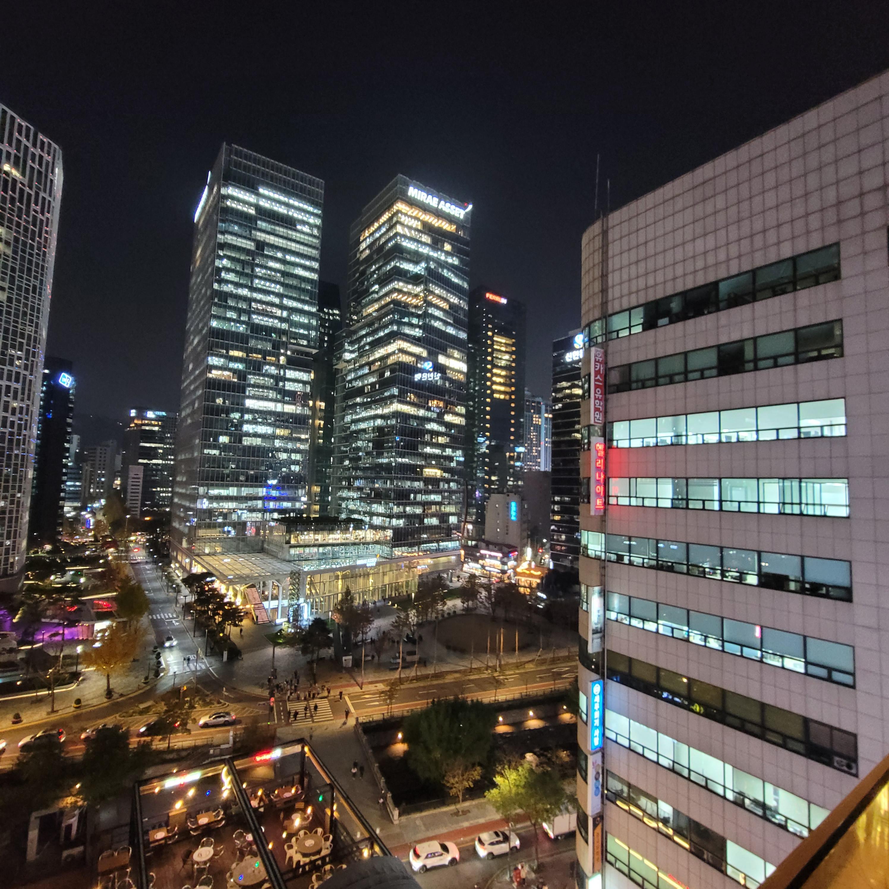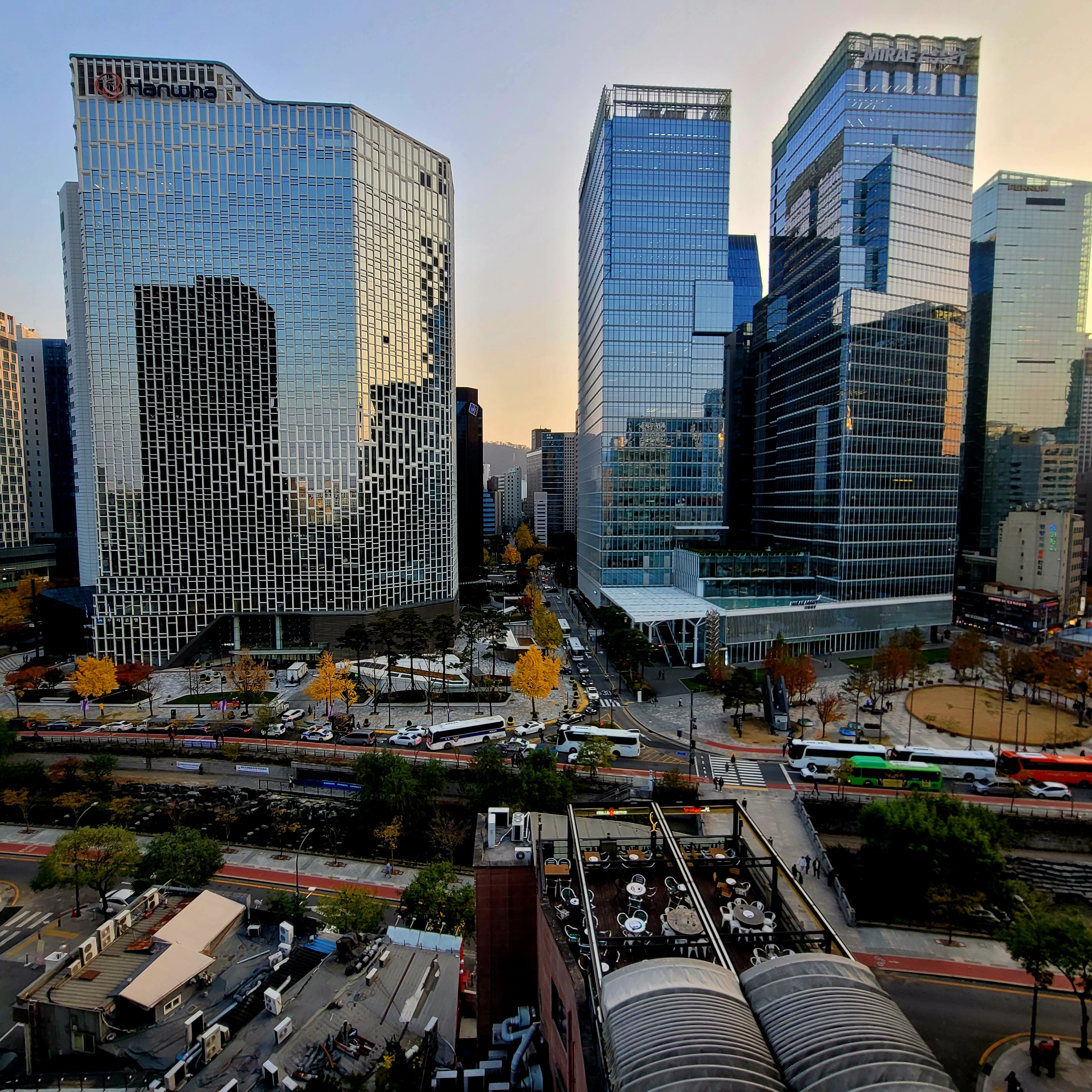 스모킹 라운지에서 바로 바라본 시티뷰다. 밑에 다른 루프탑 라운지들이 보이는데 정말 루프탑이 최근 몇 년 간 정말 많이 늘어난 것 같다. 그리고 이 구역의 터줏대감처럼 서 있는 한화와 미래에셋 빌딩을 통해 한층 더 진화된 건축 디자인의 매력을 충분히 느낄 수 있다. 커튼월의 매력은 물론이고 계속 대두되고 있는 환경과 에너지 효율의 중요성을 돋보이게 만들어진 것으로 알고 있다