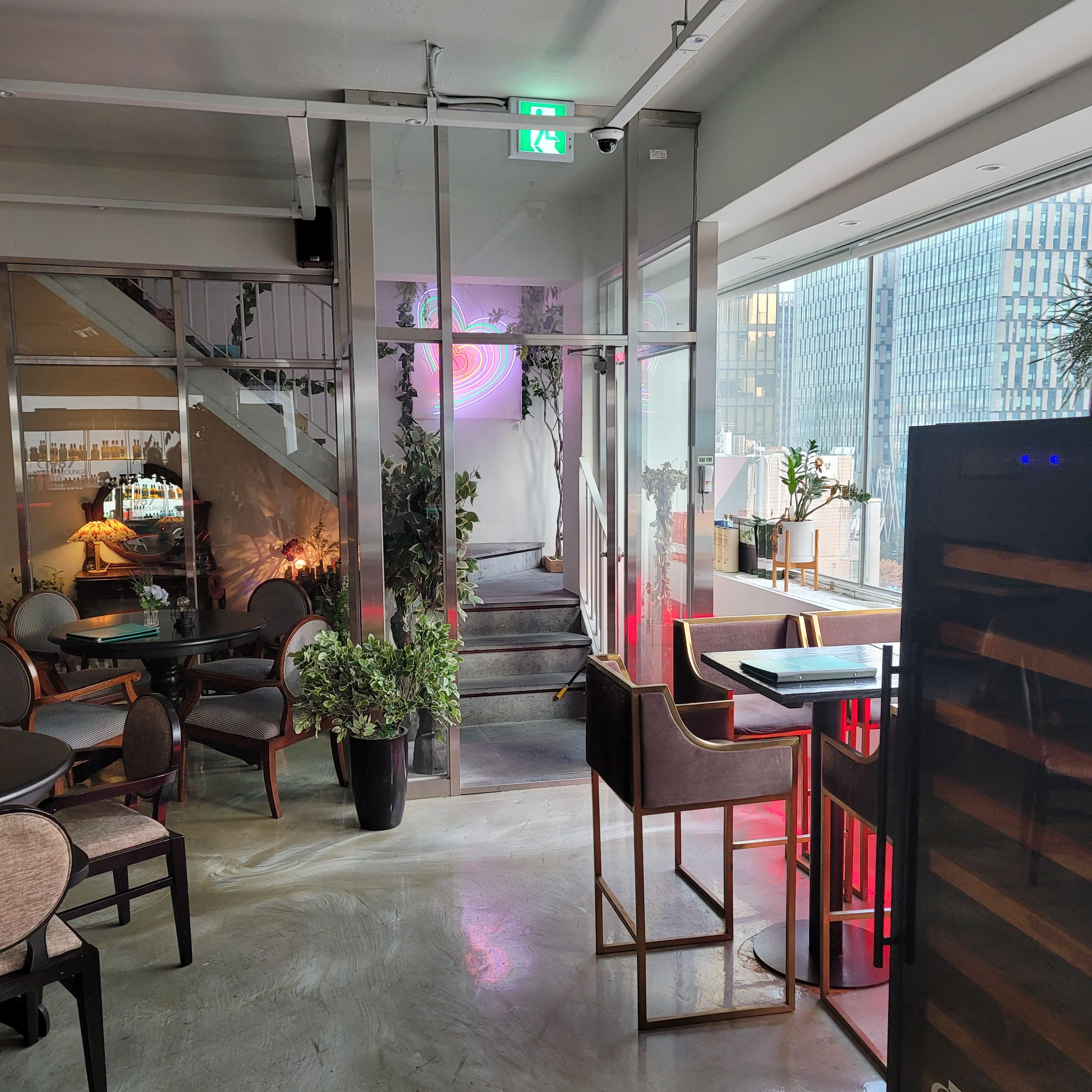 10층 실내의 아늑한 분위기와 함께 동시에 야외 뷰를 즐기려면 계단 앞의 테이블과 사진에 보이는 저 두 테이블이 안성맞춤인 듯