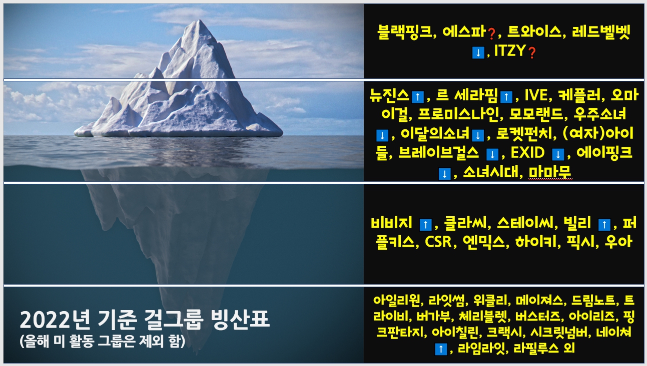 늦게나마 이렇게 올해를 돌아보았는데, 2022년 기준 걸그룹 빙산표를 만들어 보았다. 반박 시 자네가 맞음. 기준은 그냥 내가 보고들은 오디오/비디오 좋은 거 기준. 주관적임. 말이 등급이지 특정 그룹을 폄하하고자 하는 의도는 없다