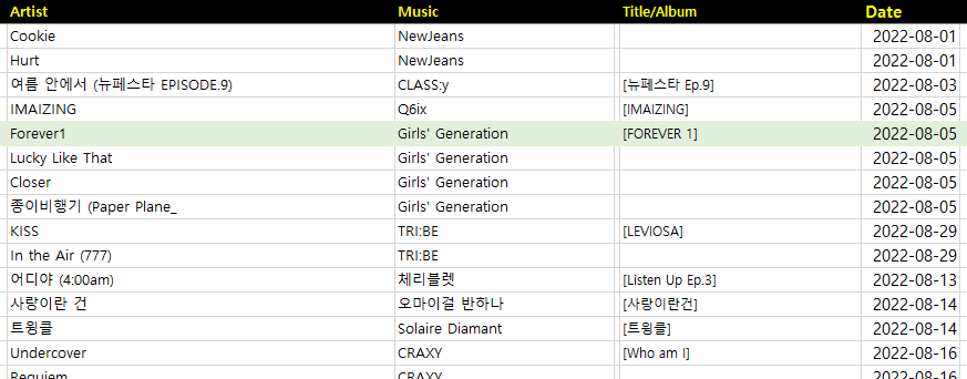 5초~15초 (좋은 건 20초 정도) 끊은 하이라이트 메들리다. 놓친 것도 있을 듯 한데 어찌하였건 모든 발표 타이틀곡 + 수록곡 중 띵곡이 있으면 같이 넣었다 (트랙 제목과 발표일 정보 리스트는 포스팅 끝에 남긴다) 음방이니 개별 채널이니 챙겨보지는 않기 때문에 뮤직비디오와 앨범 청취 기준으로 정한 리스트와 Best 선정 임을 미리 밝힌다