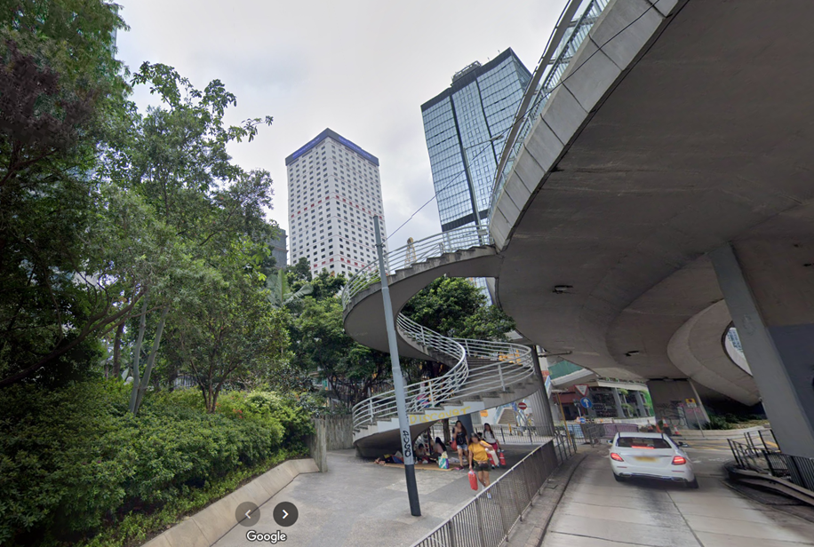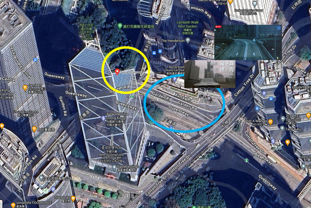 오랫동안 홍콩의 아이콘 같은 빌딩들을 한 번에 담을 수 있는 지역이다. 노란색이 나성형 계단 촬영지고, 파란색 지역은 <영웅본색 2>의 오프닝과 <천장지구>의 오천련이 웨딩드레스 입고 유덕화를 찾아 달리는 신으로 유명한 가든 로드 고가도로와 인접해 있다. 코알라 빌딩으로 알려진 립포 센터 육교에서 바라보면 I.M.Pei의 뱅크오브차이나 빌딩 그리고 구도를 바라보면 노먼 포스터의 HSBC까지 잡힌다.
