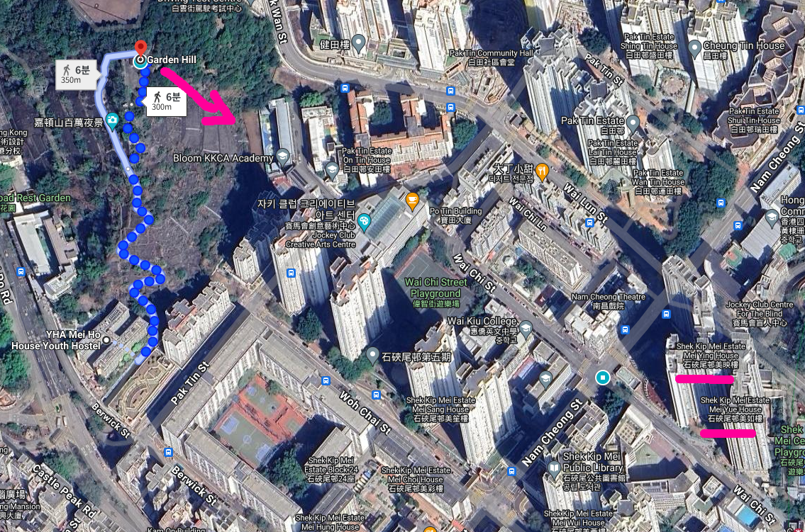 삼수이포 Sham Shui Po의 포토스폿이다. 위 사진을 찍은 bluelapisroad.wordpress.com 블로거가 얼추 시리즈와 거의 비슷한 샷을 찍었는데 보니까 함부로 이 샷을 담을 수는 없다. 셉긱메이 건너편 가든힐 Garden Hill이라는 언덕을 올라가야지만 찍을 수 있는 구도다. 위에는 주민들이 애용한다는 운동장이 있다. 야경 포토존으로도 유명한가 보다. 유튜브로 확인해 보니 다들 핵핵 거리는데 정상에 올라가 내리막으로 가는 중간에 이 샷이 잡힌다.