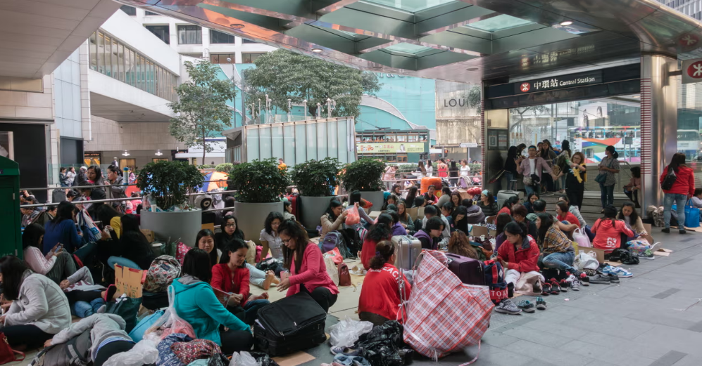 홍콩의 일요일에 센트럴과 같은 지역을 가면 호화로운 호텔이나 럭셔리 매장들을 배경으로 널판지를 피고 옹기종기 모여 하루를 보내는 필리피노들이라는 참 대조적이고 모순적인 구도의 풍경을 자주 볼 수 있는데 처음 보면 충격이고, 살다보면 익숙해지는 풍경이다.