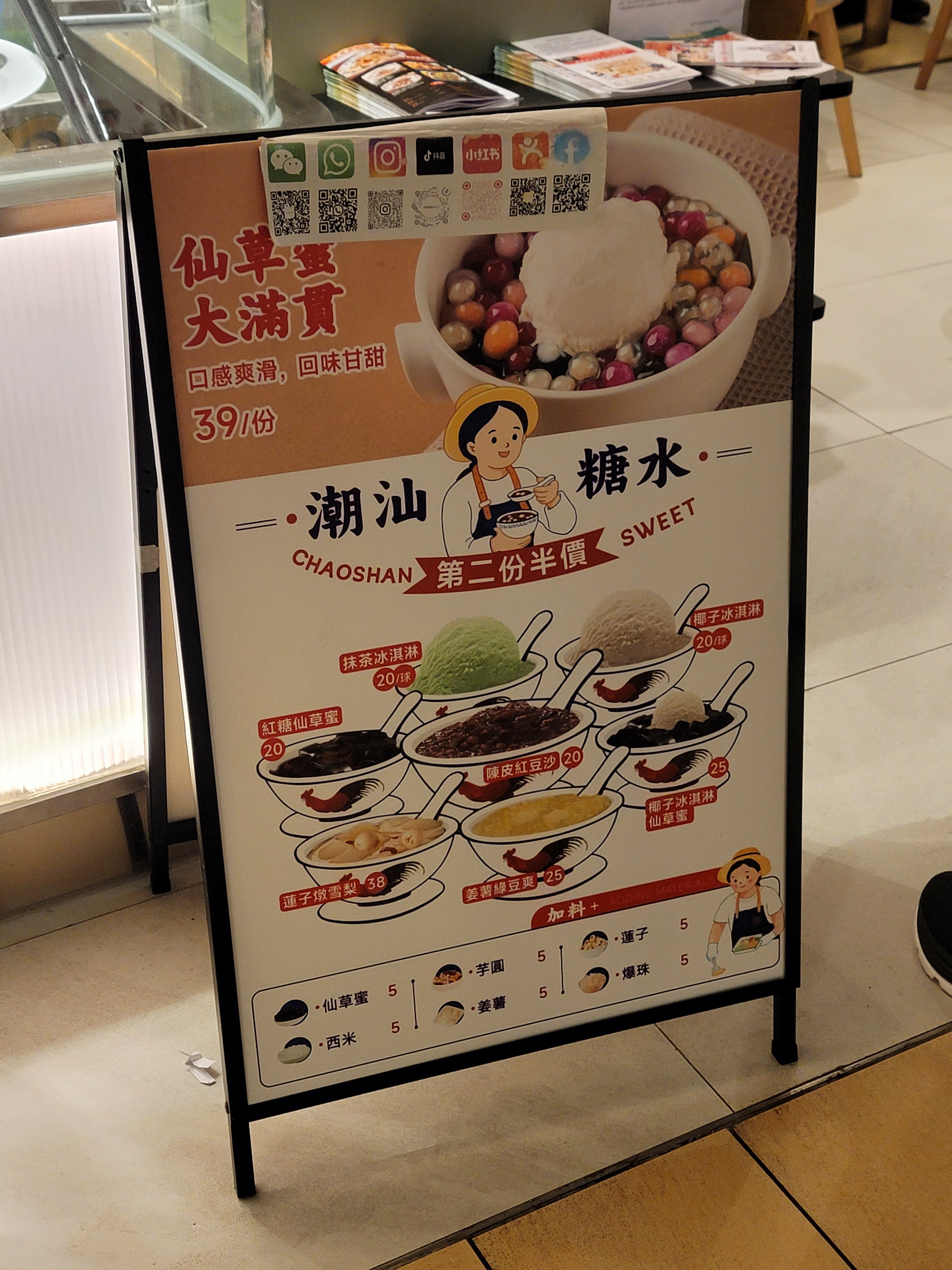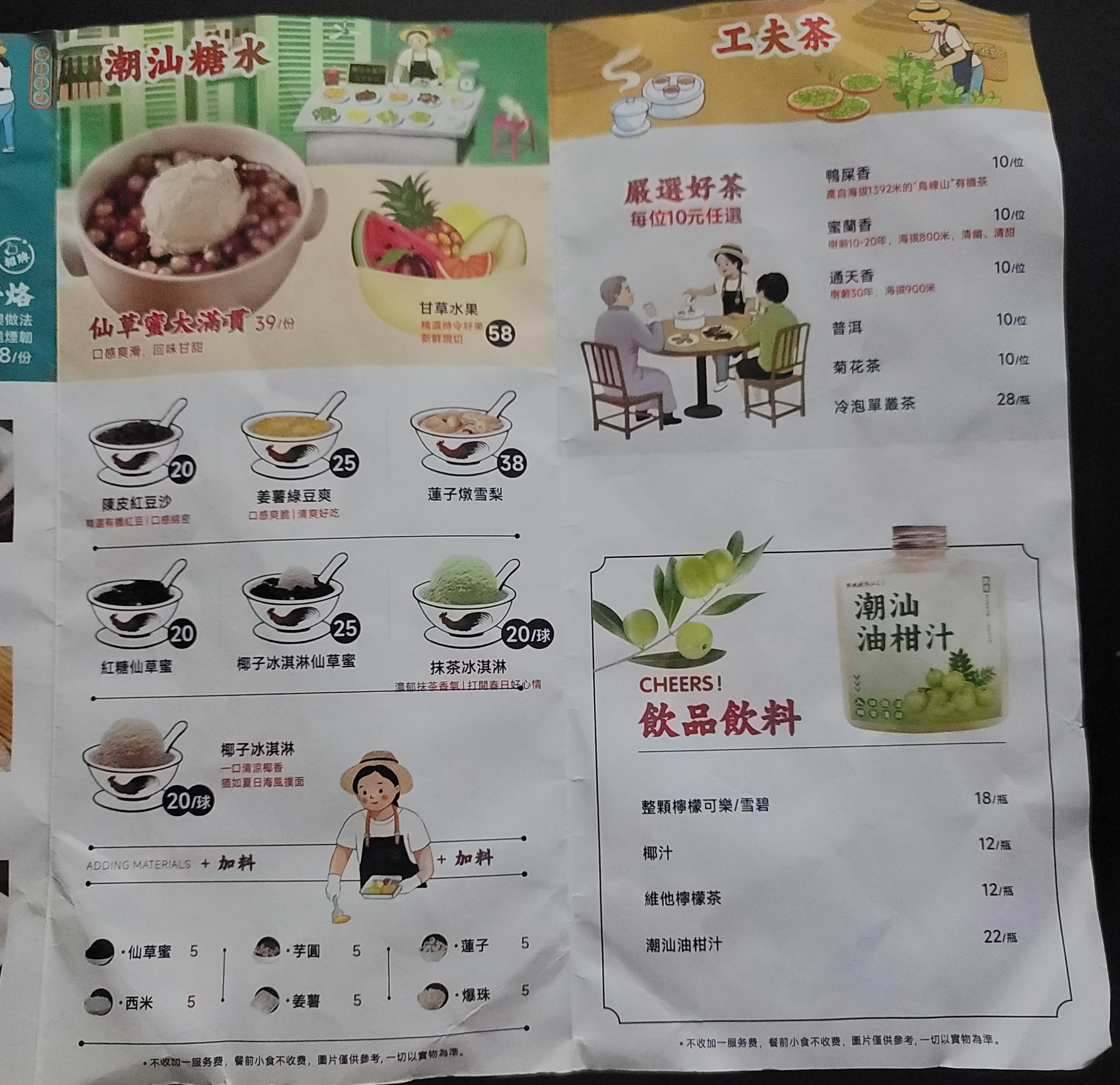 단거는 안 먹는 편이라 자세히 보지는 않았지만 그 밑에는 달달한 디저트 메뉴를 따로 소개하고 있다. 대만식과 차오산식 그리고 커스터마이즈 할 수 있는 추가 재료들. 潮汕 Chaosan 차오산이라는 단어가 눈에 들어오는데, 조주(潮州)는 도시 이름으로 보면 되고, 조산(潮汕 차오산)은 조주와 인근 한 산터우 지역을 모두 포괄하여 부르는 지역 이름이라고 한다. (TMI..ㅜㅜ)
