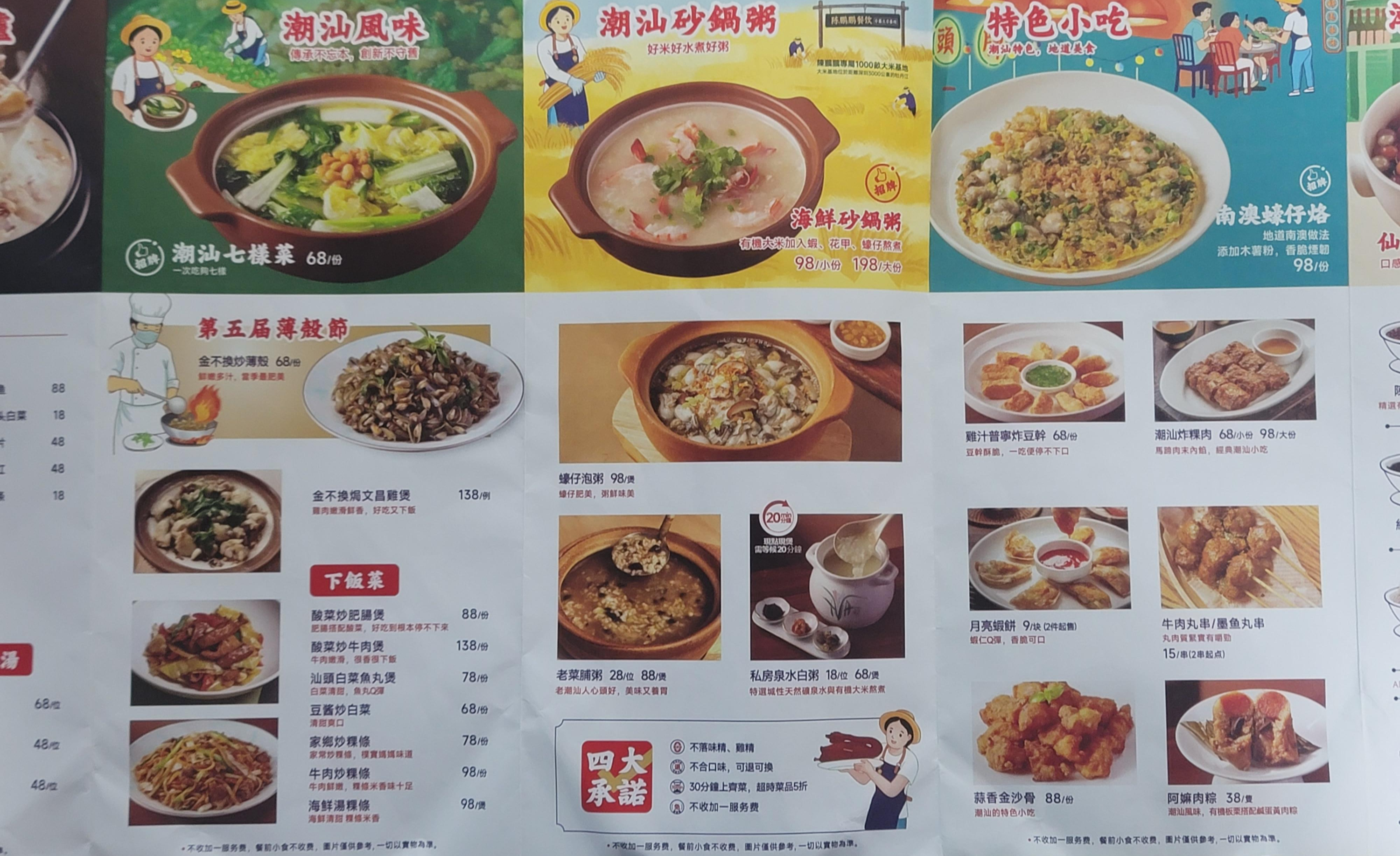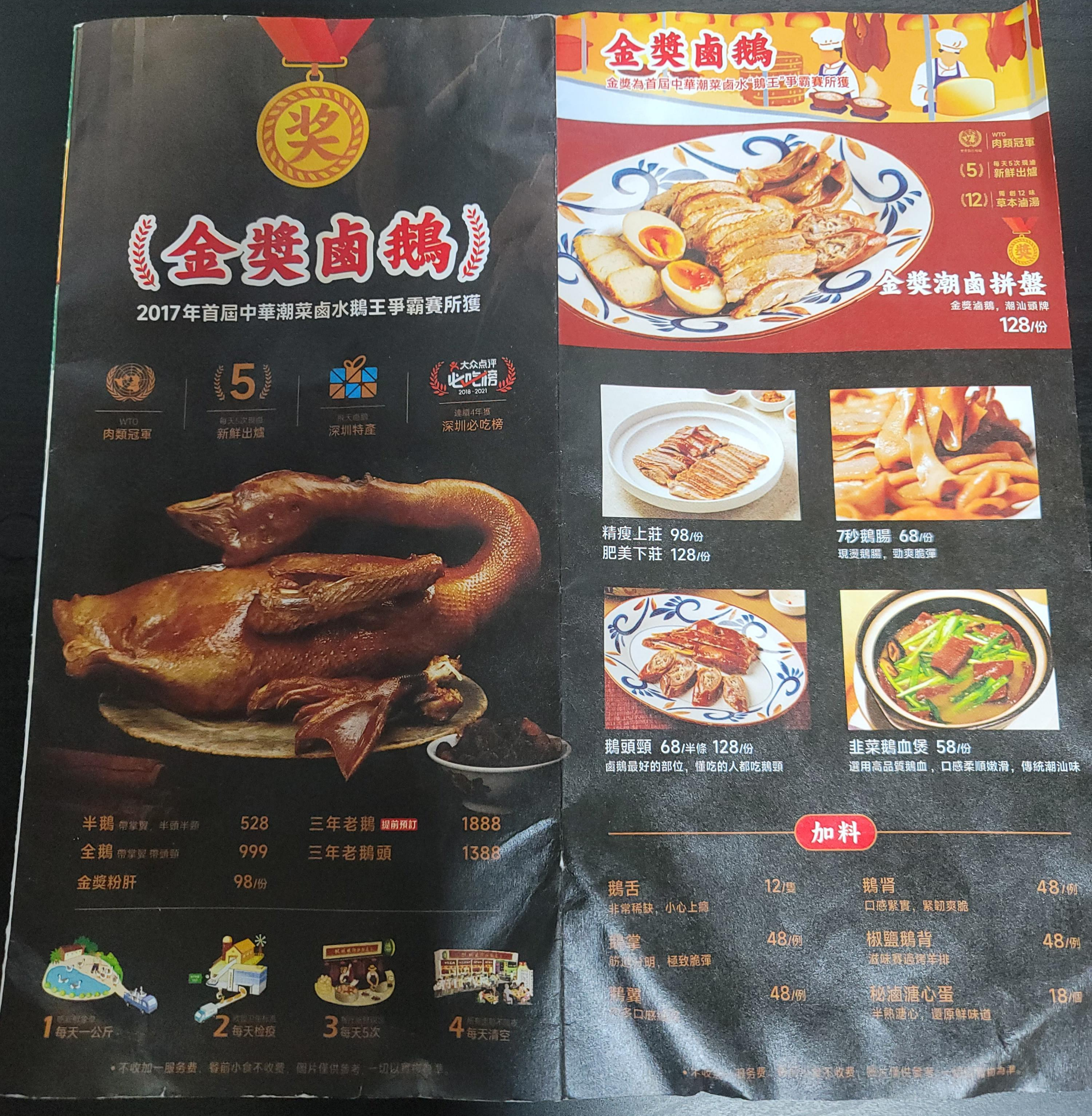 메뉴에는 당연히 화려한 소개글들이 있는데 번역해 보니 대략 광둥성 치우차우 식 요리집이다. (潮州를 읽으면 한국어로 '조주', '치우차우'는 광둥어 발음, 그 지역권 사람들의 민남어 발음은 '테오추'라고 한다. (나무위키보니) 그 지역 사람들은 만다린을 잘 쓰지 않는다고 한다 (만다린 발음은 차오저우 임)). 암튼 음식점 시그니처 메뉴는 거위요리와 치우차우 식 죽이다. 메뉴의 요약은 아래와 같다.