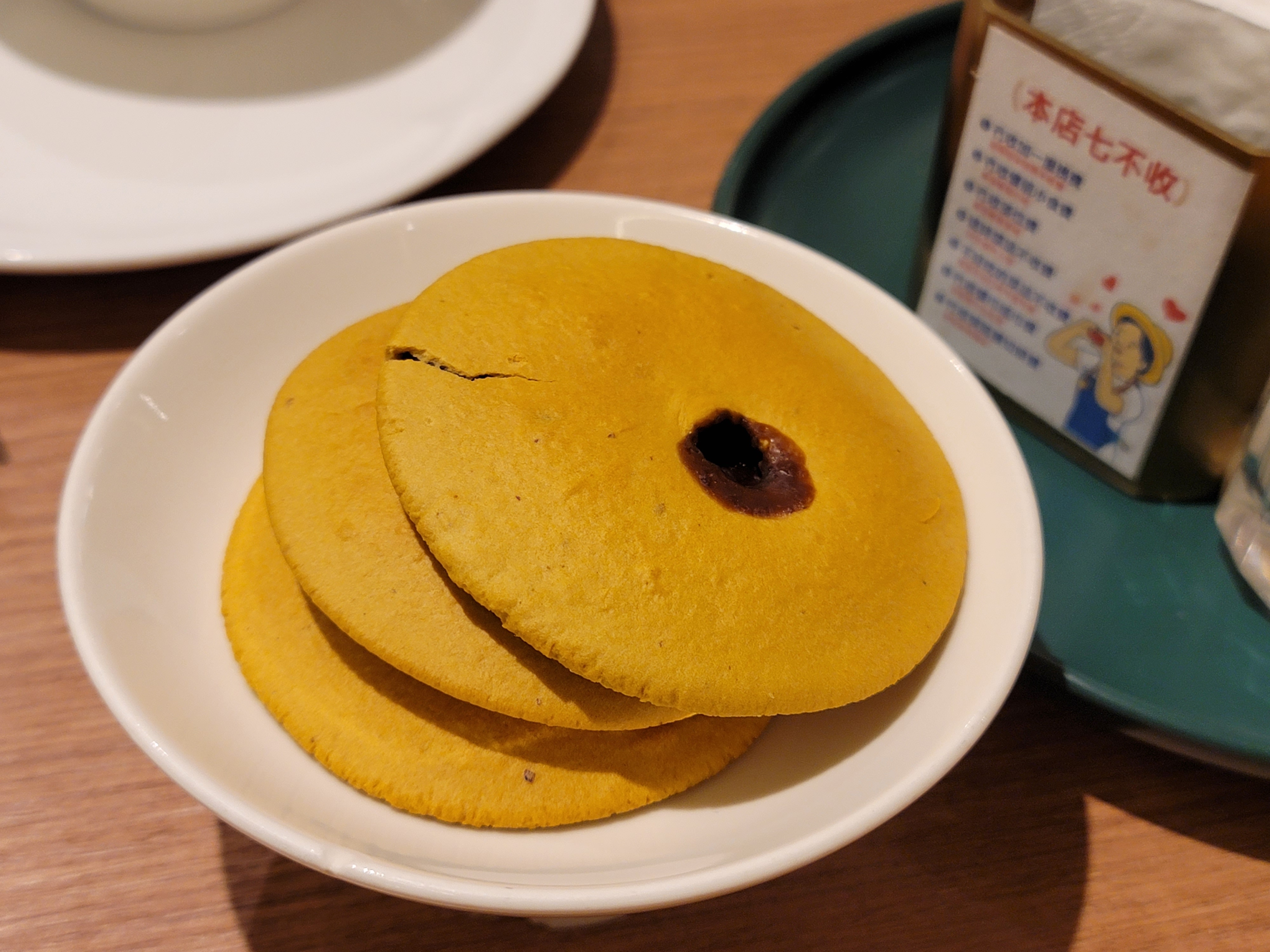 먼저 주문하기 전에 자리 앉으면 바로 나오는 무료 식전(?) 디저트, 肚臍餅(두제빙). 너무 달아서 한 입만 살짝 베어 맛만 봤다. 비주얼에 딱 보이는 바삭+달달 맛이다. '배꼽떡'이란 건데 차오산 지역에서 유명하다고 한다. 이름은 그냥 배꼽 모양 닮아서 그렇다고 ㅎ. 바삭한 껍질과 얇고 부드러운 흑설탕 필링에 씹으면 질긴 질감이 특징이라고 한다. 단거 좋아하는 사람들은 맘에 들 듯하다.