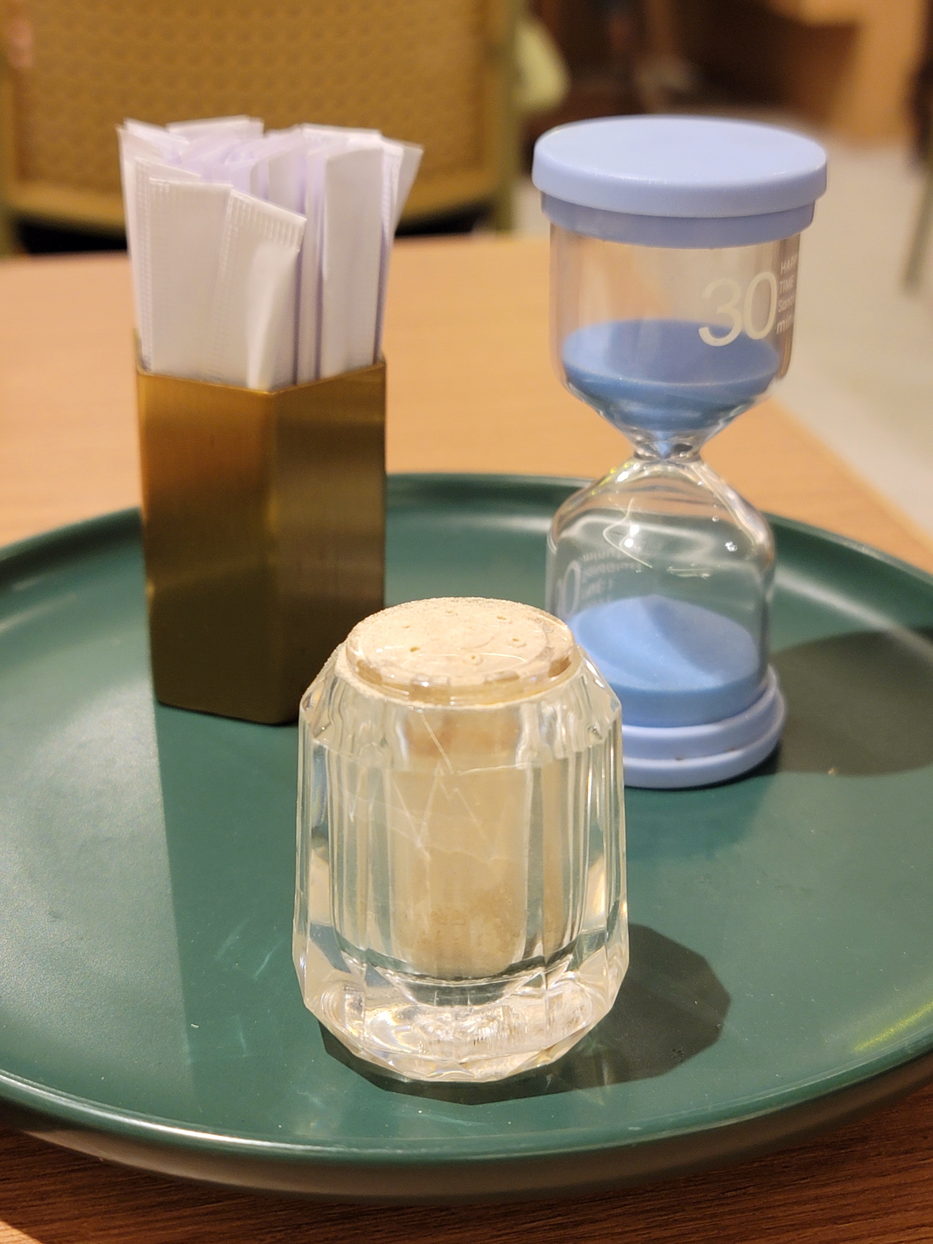 자리의 기본 세팅. 저 모래시계는 전광판에서 본 그 30분 이내 요리가 안 나오면 돈 안받습니다를 실천하는 모습이다. 해보진 않았는데 재미 삼아 주문하고 시계 돌려놓으면서 가게 내부 풍경도 보고 메뉴도 보면서 기다리면 될 듯.