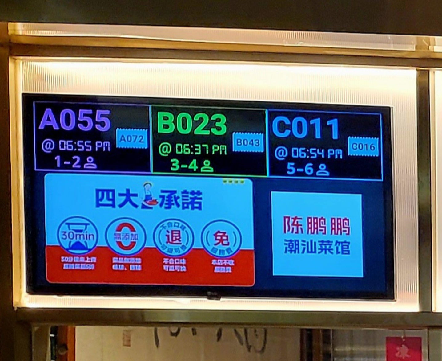 말 그대로 기다림의 뜨거운 열기가 너무 핫한 나머지 중간에 지쳐 나가 떨어지는 팀도 많았다. 덕분에 생각보다는 일찍 들어갔지만. (6시 40분 즘 등록, 8시 45분경 입성, 두 시간 ㅜㅜ) 전광판 하단 공지를 보면 음식이 불만족스러우면 환불 보장이라는 것 같은데 맛에 자신은 있나 보다. 그래서 사람들도 기다리나.