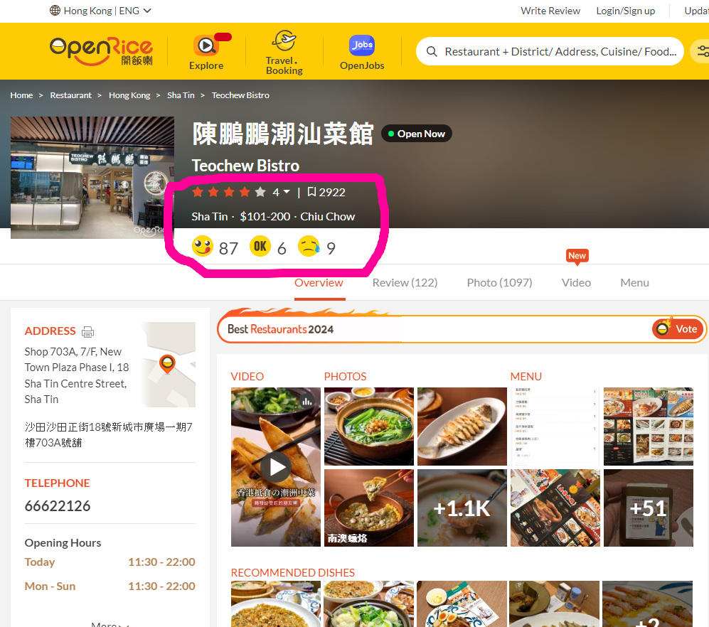 홍콩 로컬 맛집 앱 , 오픈라이스(Openrice.com)의 평점도 괜찮다. 2900여 명 참여 5점 만점 중 4점.