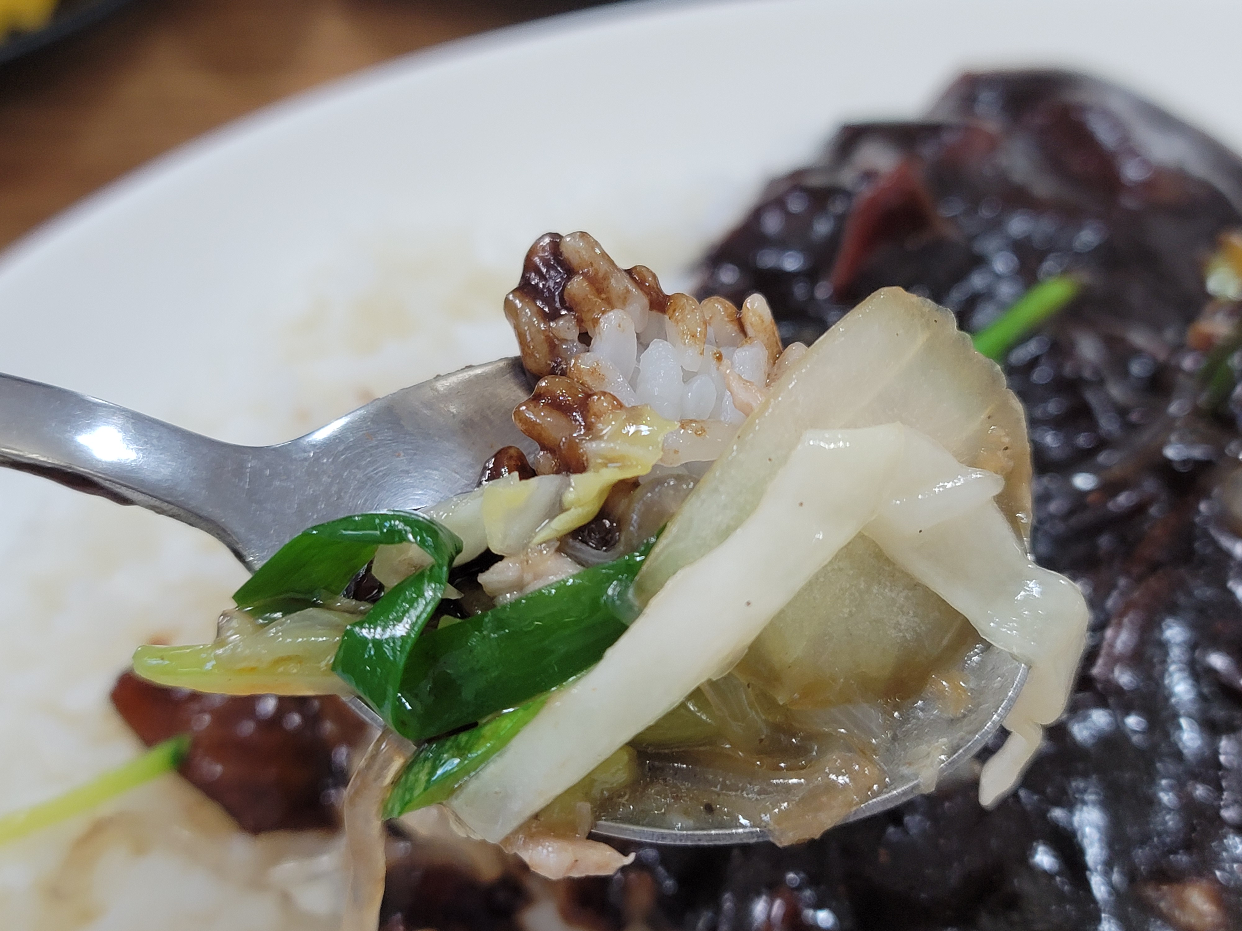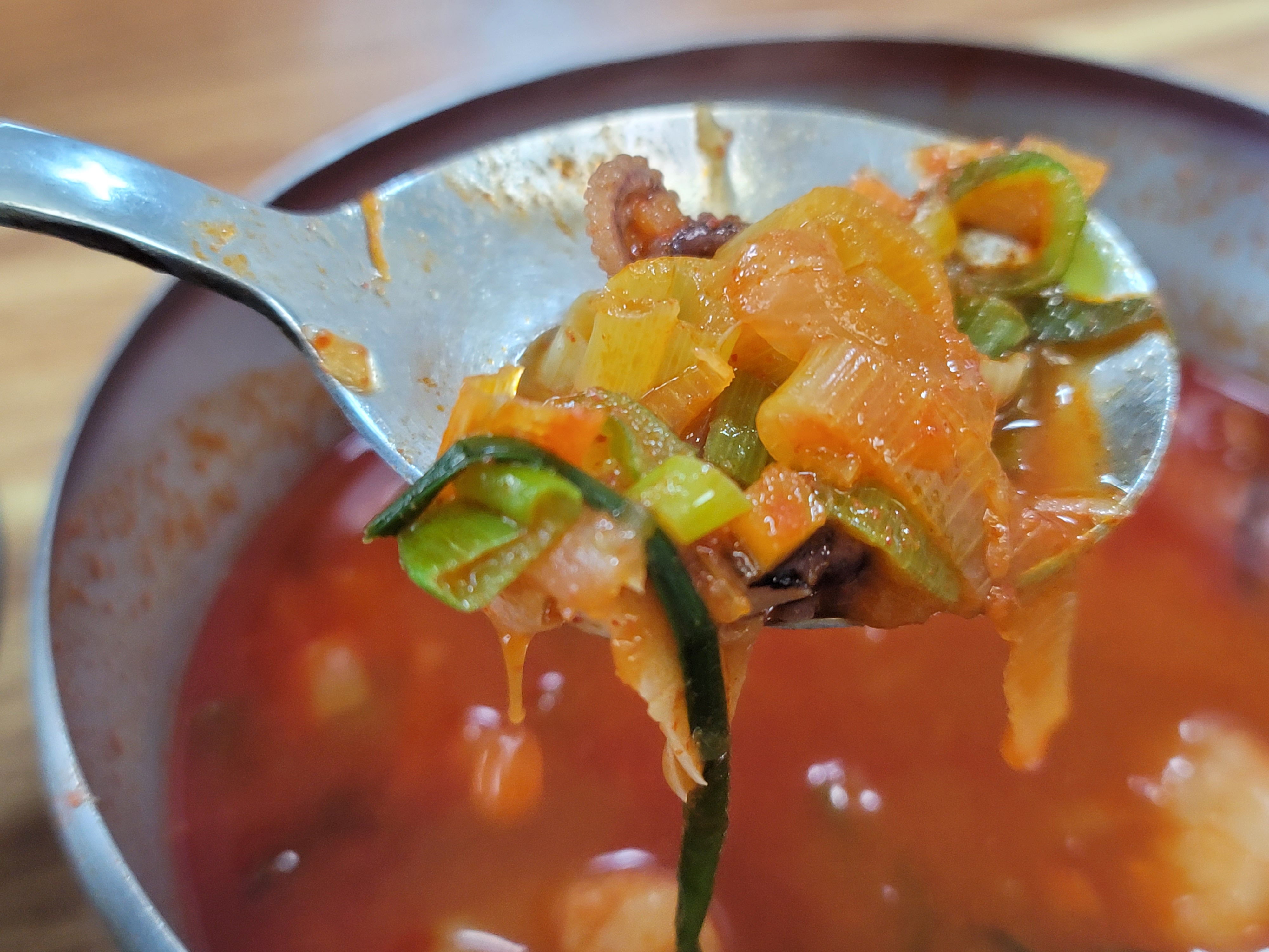 여느 중국집 볶음밥 시키면 나오는 수준의 양의 짬뽕 국물도 괜찮았다. 갠적으로 파, 양파 같은 채소 많이 들은 것을 좋아해서 그런지 이런 건더기들이 꽤 많았던 짬뽕 국물이랑도 같이 먹어주니 괜찮았다. 둘의 밸런스가 괜찮다! 짜장면을 시키지 말고 차라리 짬뽕을 시킬 걸 그랬나.