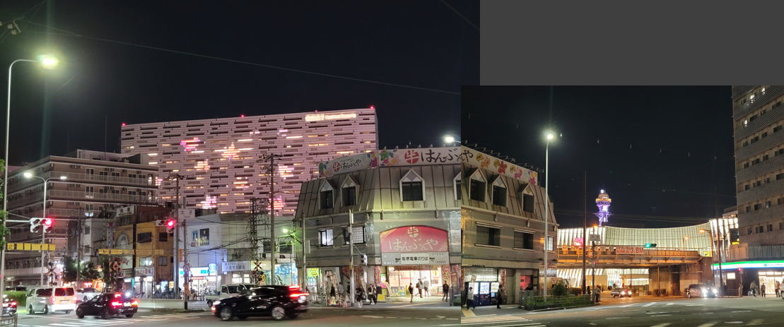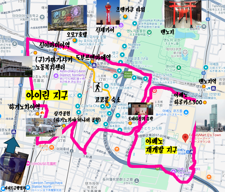 파노라마 식으로 보면 이곳이 꽤 큰 사거리임을 알 수 있다. 왼쪽 중앙에 빛나는 하얀 건물은 오모7(Omo7)호텔이다. 흔히 오사카가 숨기고픈 '슬럼가' 이미지로 알려진 니시나리구 아이린 지역의 이미지를 쇄신하기 위해 세워졌다고도 한다. 진위는 관계자들만 알겠지만, 공격적인 마케팅의 호시노 리조트 주식회사가 이 지역에 고급 호텔을 선보인 점은 흥미롭다. 이 지역 특성 때문인지 5성급 호텔임에도 가격대가 꽤 합리적이긴 하다. 관광지인 북쪽의 신세카이 쪽으로는 열려있지만 아이린 지구 방향으로는 밖을 나갈 필요 없다는 듯, 담장을 두고 큰 정원이 구성되어 있는 것이 인상적이다.