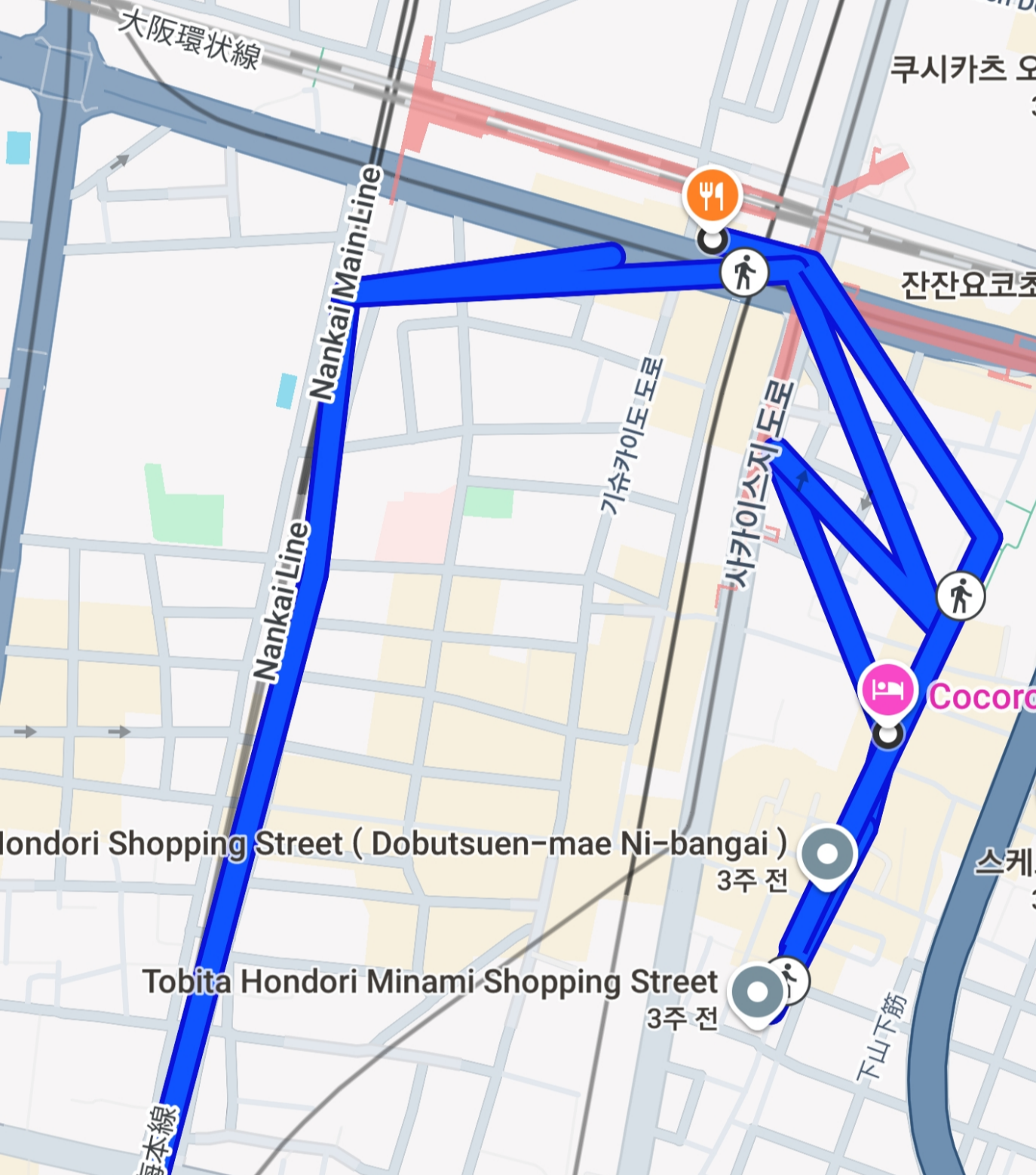 매우 대략적으로 아이린 지구 행정 구역을 표시해 보았다. 지도에서 중간의 노란색 라인은 코코룸 게스트하우스로 가던 길을 표시한 것. 아이린지구의 상징이라 할 수 있는 '(구) 가마가사키 노동복지센터'와 '삼각공원'을 표시해 두었는데, 이 주변이 전 세계 블로거나 유튜버들이 "일본/오사카 최대 우범지대!" 같은 콘텐츠를 만들어내기 위해 자주 방문하는 지역이다.