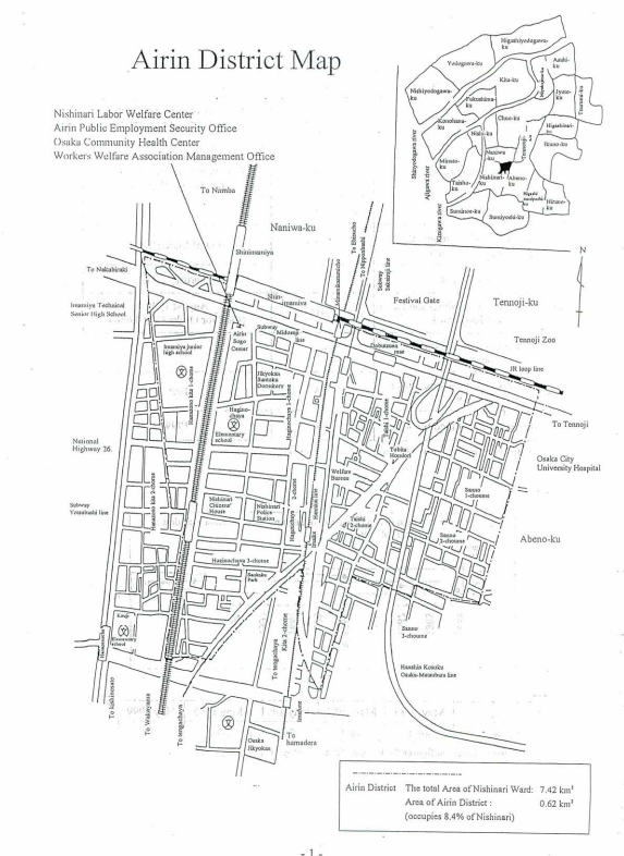 영화 <실종>에서 묘사된 삼각공원(하기노차야 미나미 공원)은 노숙자들을 위한 배급 장면으로 등장한다. 이곳은 한때 활기찼던 일용직 노동자들이 몰락하며 노숙자로 전락한 모습을 상징적으로 보여주는 공간이기도 하다. '카마가사키 포럼'의 자료를 참고해보면 저 이이린 지구의 간단 역사는 아래와 같다.