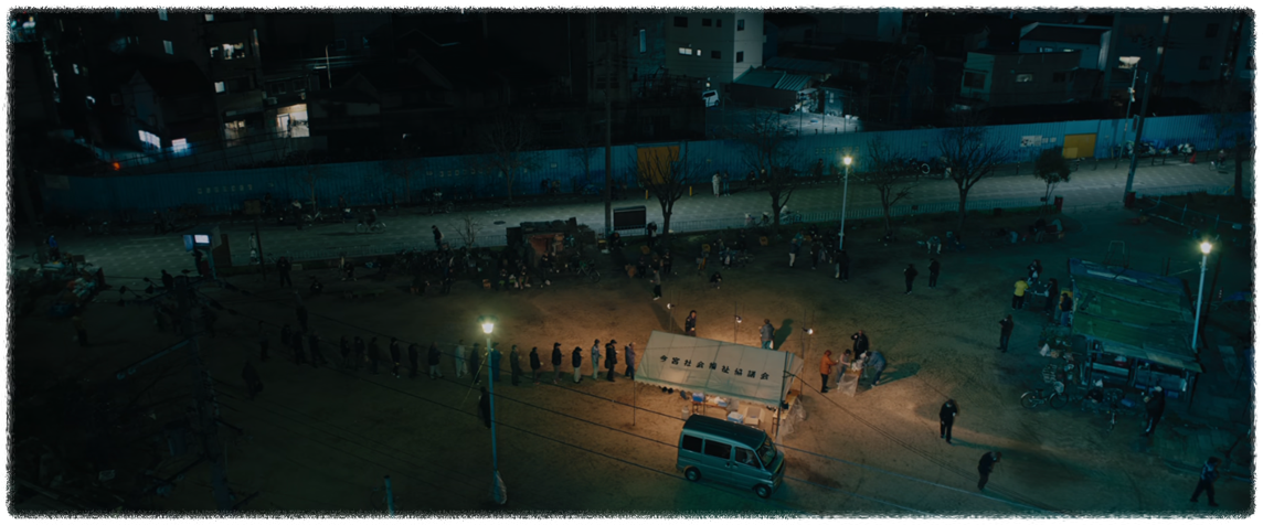영화, <실종>에서 묘사 되었던 삼각공원 (하기노차야 미나미 공원)의 노숙자들을 위한 배급 모습.