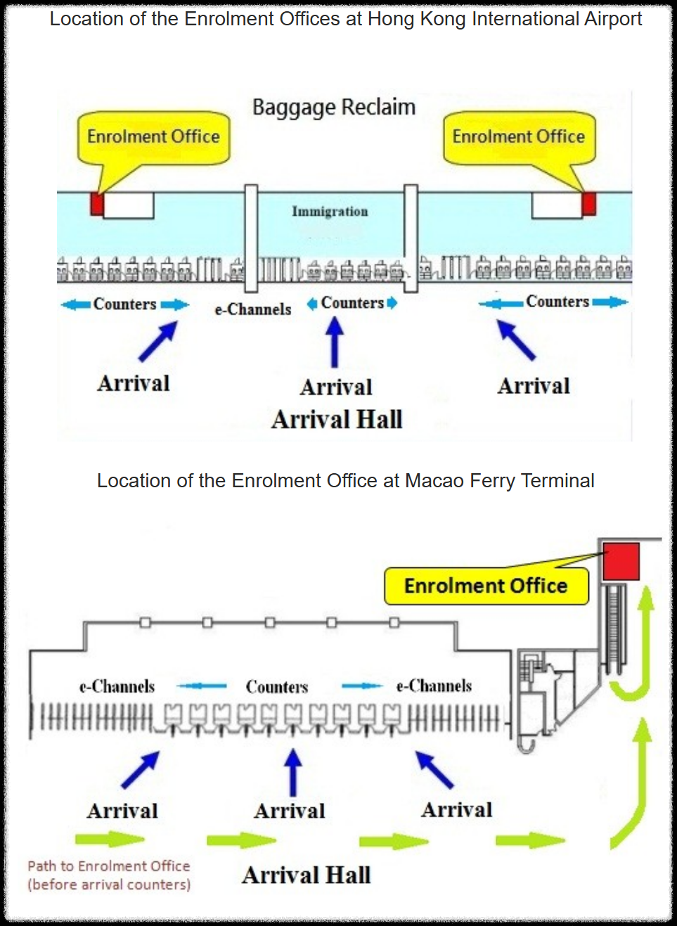 '26년 기준 홍콩 이민청 공홈에 따르면 대표적으로 다음 세 곳에서 이채널을 등록할 수 있다: 1) 정관오 이민청사 본청 7층 2) 홍콩공항 입국 '후' 카운터 3) 마카오 페리 터미널(입국 '전' 카운터)