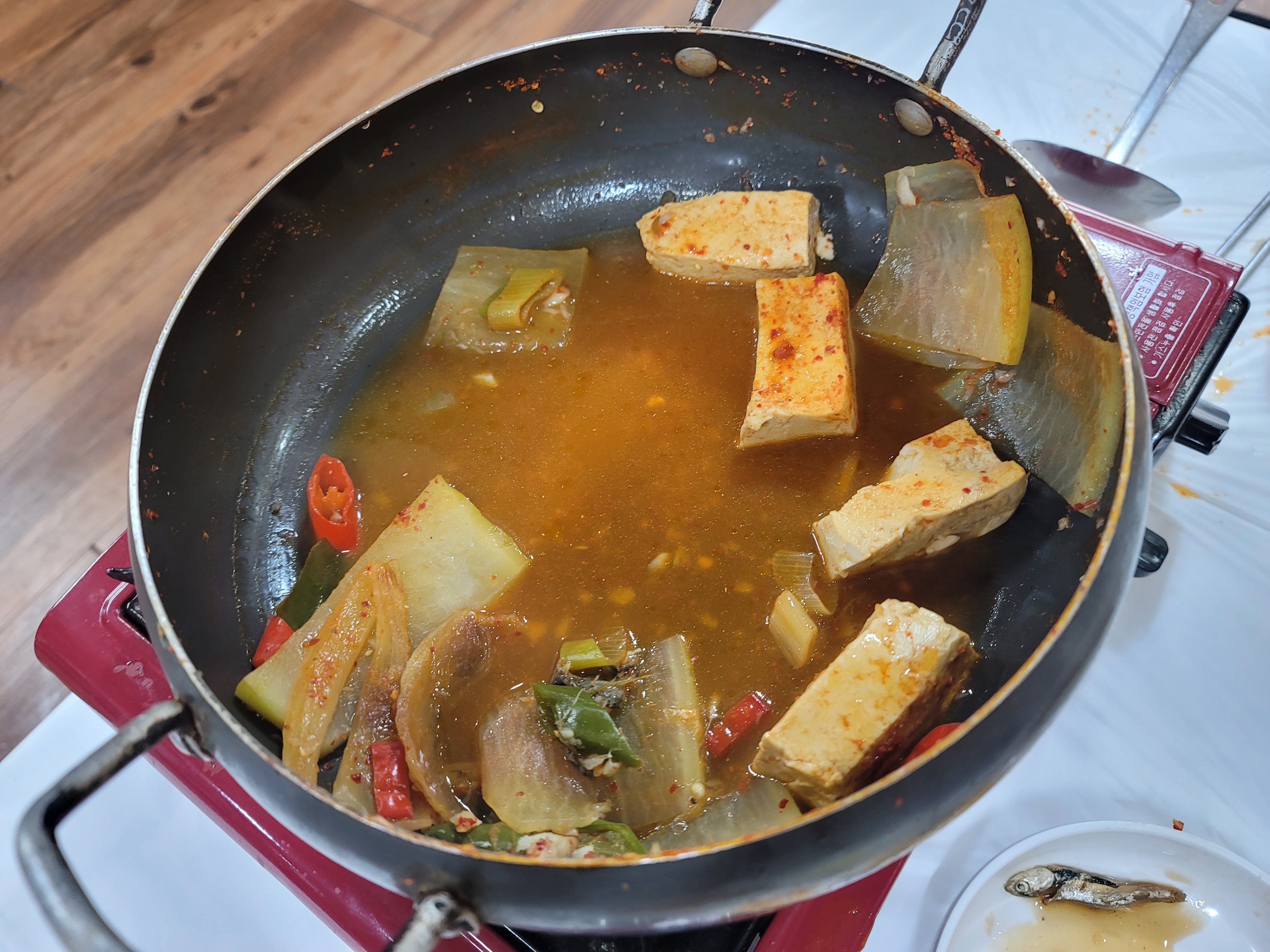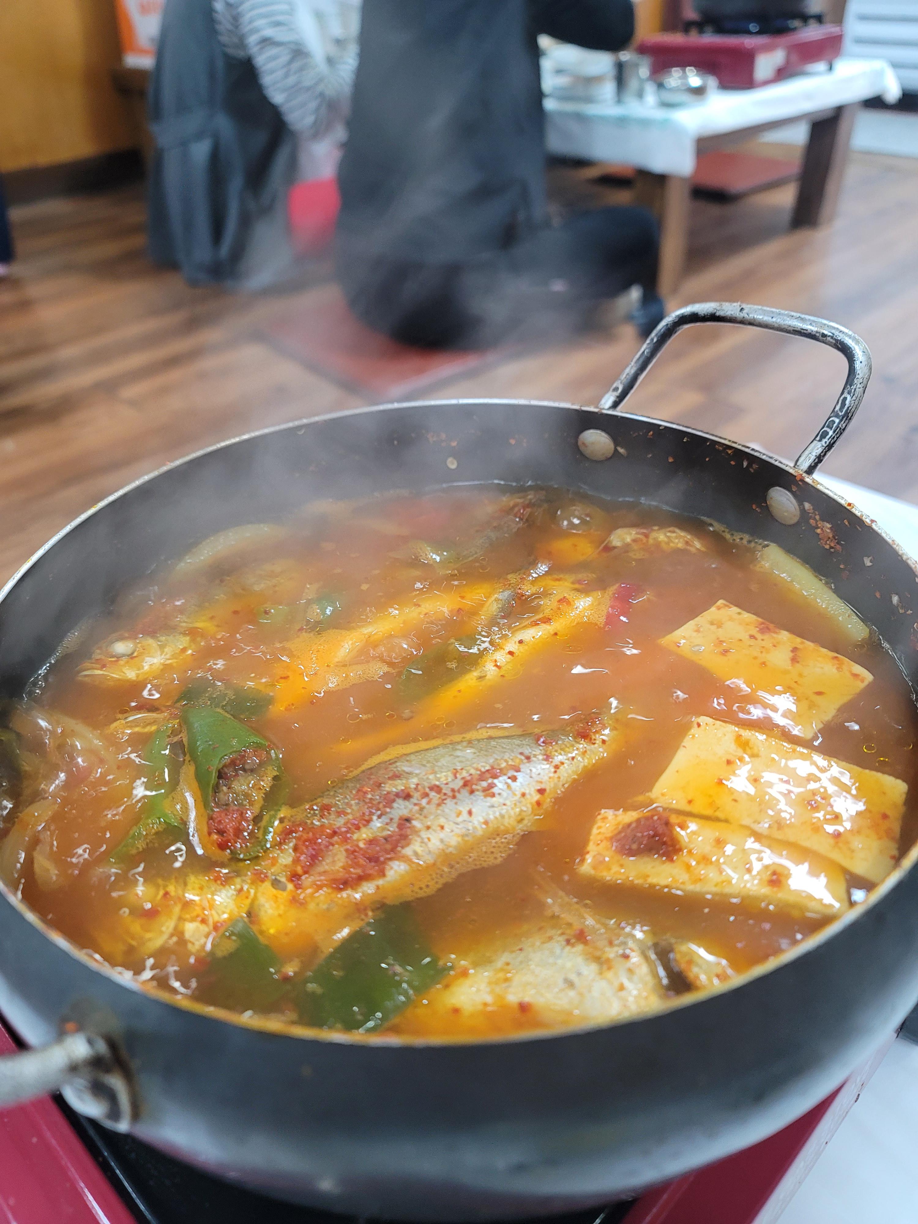 이 조기찌개의 맛에 홀린 듯, 반찬들, 김치찌개, 계란, 밥 모두 싹싹 긁어 먹었다. 정말 홀린 듯 먹어 치웠다. 아침 8시부터... 고추장이 아닌 고춧가루로 끓인 것 같은데 당연 칼칼하고 텁텁하지도 않고 무 등과 섞이며 달큼하고 맑고 적당히 담백한 맛이 느껴진 배부른 한 끼였다. 단점은 아침부터 너무 많이 먹어서 하루종일 배불러서 힘들었다는 것