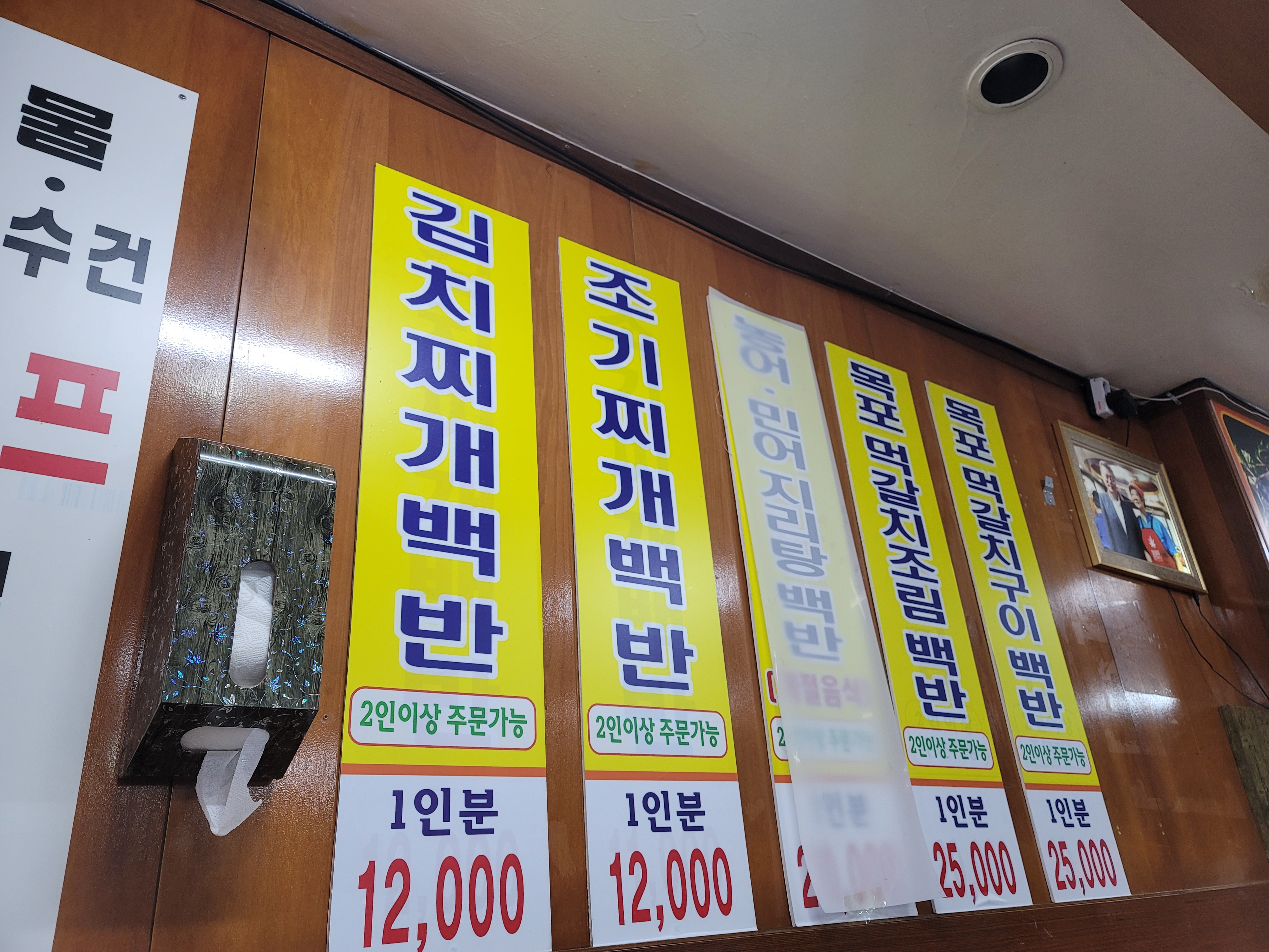 오픈 시간 5분 정도가 지나 들어갔는데도 손님들이 꽤 차있어서 식당 인테리어는 못 찍었다. 암튼 메뉴로 넘어가 딱히 먹을 생각은 없었지만 농어와 민어는 제철이 아니라 그런지 팔지 않고 있었다. 잠깐 고민했는데 김치찌개야 늘상 먹는 거라 넘겼고, 목포 9 미(味) 중 하나라는 먹갈치조림은 딴 곳에서 먹을 예정이라 패스. 또 여기까지 와서 일반 백반만 시키기는 좀 그렇지 않나 하는 마당에 조기찌개백반이 눈에 들어왔다. (지금 생각하면 너무나 잘 한 선택이었다)