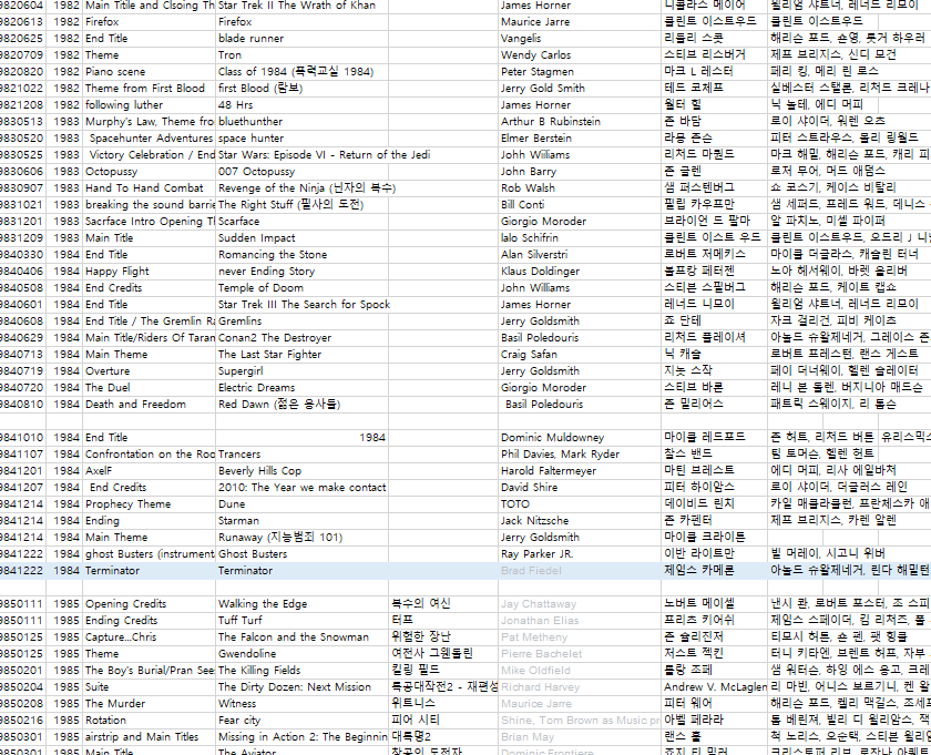 그리고 뭐 하나 파기 시작하면 쓸데 없는 곳까지 들어가는 성격이라 원래는 인디아나 죤스, 백투더 퓨쳐, 스타트렉 이런 유명한 OST만 넣고 1980년대 후딱 건너뛰려고 했으나 결국 파고파다 보니 뭐가 되게 많이 나와서... 1985년에 막혀 그것도 5월 중간에 잘랐다... 거기다가 플리라 한 시간 여 분량으로 만들다가 너무 길다고 길다고 해서... 20분 정도로 잘라서 나눔. 근데 이렇게 짧게 자르면 동영상 편집도 편하고 블로그 포스팅 올리기도 한결 편하긴 하다. 일단 1시간 짜리면 블로그 글도 길어질 수밖에 없고..