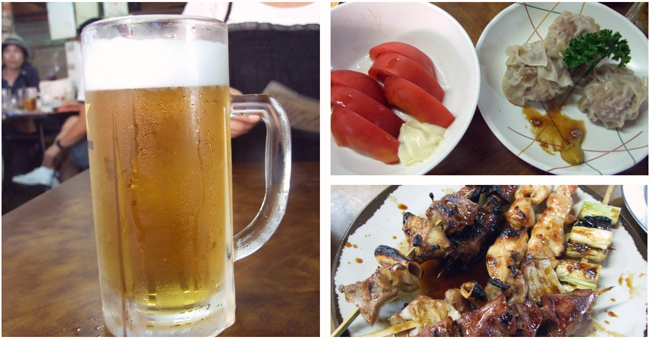 삿포로 생맥, 차가운 토마토, 슈마이, 개별 야키토리