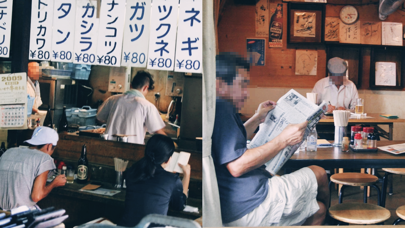 이렇게 혼자 와서 책을 읽거나, 신문을 보거나, 무언가를 쓰고 있거나 하는 이런 풍경이 참 좋았던 곳이다. 지금도 그럴진 모르겠지만 술을 겸하는 곳이기도 하고, 나라도 나라고, 시절도 시절이라 안에서도 담배를 피우던 곳이다. 특히 당시 국내는 이런 혼밥 문화가 지금처럼 활성화되지 않았던 시기라 개인적으로 혼자 가려면 저녁의 포장마차 정도였는데 나도 이렇게 편하게 갈 수 있는 맛 집이 있었으면 하는 부러움도 있었다. 이제는 그래도 혼밥 문화가 꽤 널리 퍼져 있어 다행이라고 생각한다. 어디 혼자가서 밥만 먹는 곳도 아니고 분위기를 즐길 수 있는 그런 곳 (Bar 한정 말고 말이다!)
