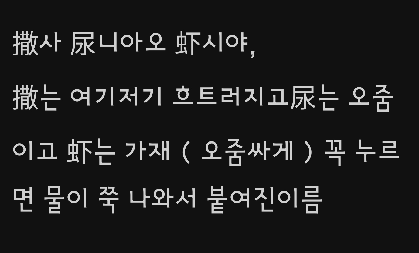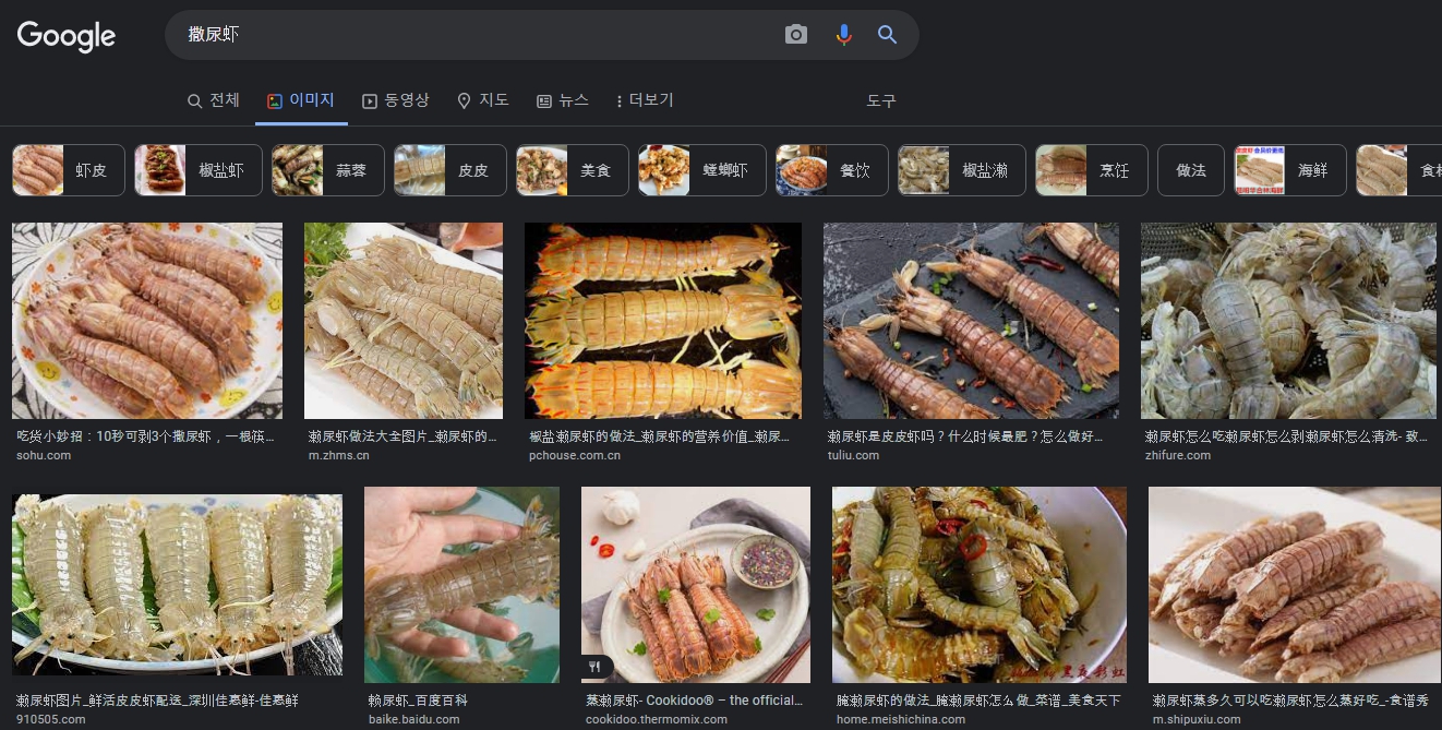 TMI로 홍콩/중국에서 먹던 저 아이들의 이름은 撒尿虾사니아오 시야(오줌싸게)라고 한다. 한국어로 번역 쳐보니 오줌새우라고 한다.