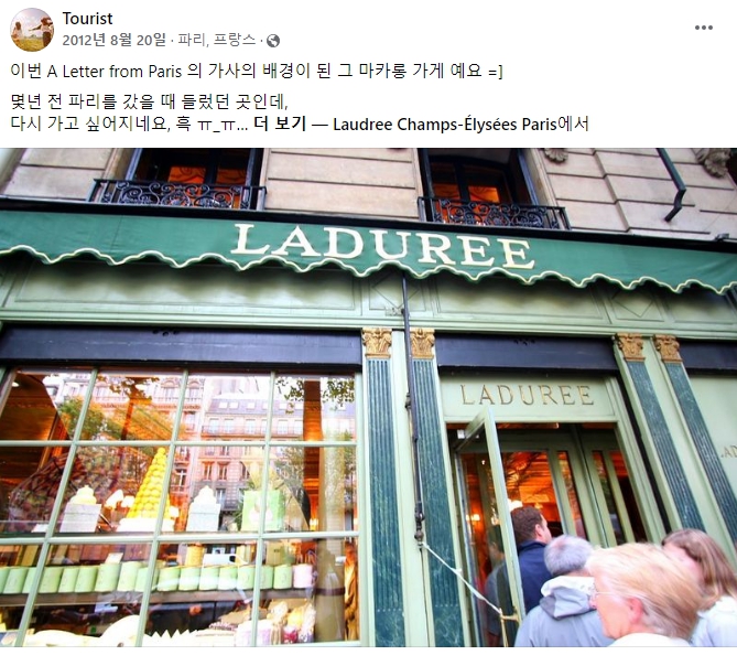 론리플래닛 매거진 코리아에 기고도 하던 프로젝트 음악밴드였다. 지금이라면 여행유튜번데 그걸 음악과 사진/글로 풀이하던 식으로 보면 되겠다. 구성도 웹툰 작가, 여행사진작가 등등 특이했던 걸로 기억한다. 지금은 누구나 다 아는 파리 샹젤리제의 유명한 Laduree가 테마가 된 곳이었는데 그 시절에는 마카롱이란 게 지금처럼 흔하지 않은 시절이었다. 2000년대만 (가물가물 한데 아마 초중반 일듯) 해도 (내가 알기엔) 대한민국에서 유일하게 마카롱을 팔던 곳은 신세계 강남점 2층, 그것도 생뚱맞은 위치의 '예쁘게 꾸민 리어카' 가판대 같은 작은 곳이 유일했다. 아마 조선호텔과 관련된 아프레 미디였던 것 같다. 당시 서울 강남에서 마카롱을 판다는 소문이 파다하게 흘러나갔던 기억이 난다. 2016년에 드디어 이 라뒤레가 신세계 강남점에 공식적인 카페 공간으로서 자리 잡았다.. 소소한 자랑이지만 그 시절 선물 받은 Laduree 파리 본점의 마카롱을 먹고 신세계 것과는 또 다르게 엄청 맛있었던 기억이 난다