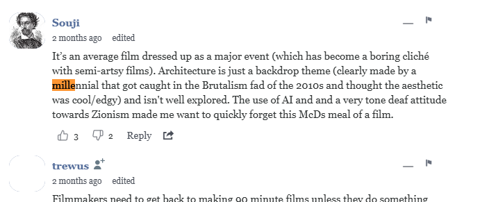 Dezeen에 달린 이 댓글은 The Guardian에서 비꼰 커피 테이블 북 등을 통해 유행한 브루탈리즘을 얄팍한 트렌드로만 소비했다는 시선과 비슷한 맥락에 있는 것 같다. 브루탈리즘이 단순히 "멋지고 쿨한" 미학적 코드로 축소되면서 본래의 사회적, 기능적 맥락과 철학적 깊이가 사라졌다고 해석할 수 있다. 즉, 건축이라는 복합적이고 의미 있는 분야가 영화라는 매체를 통해 가벼운 스타일이나 유행의 소재로 전락했음을 일반 관객의 시선에서도 냉철히 비판한 셈이다.