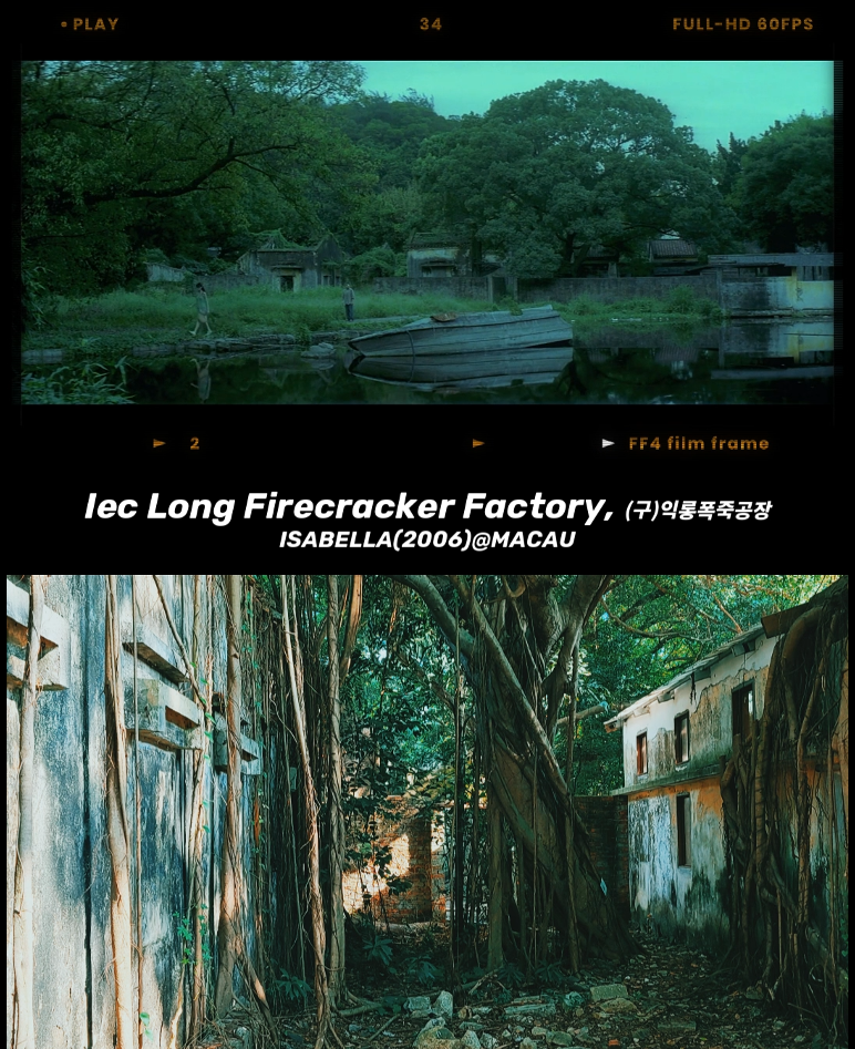 - 현장메모: 영화 속 처음으로 마카오의 '자연'을 경험할 수 있는 장소. 다만 산책로 조성 및 건물 진입 통제로 인해 정확한 촬영 ‘스폿’이라기보다 ‘사이트(부근)’에 해당한다. 연못은 접근조차 불가능했지만 폐허와 자연이 뒤엉킨 전체적 풍경은 영화처럼 독특하고 신비로운 분위기를 자아냈다. 마치 인류가 사라진 아포칼립스가 연상되는데, 산업 쇠퇴 후 방치된 시간 속에서 함께 뒤엉켜 살아온 식생과 폐건물의 모습은 인간의 시간과는 다른 차원에 남겨진 기억처럼 다가왔다.