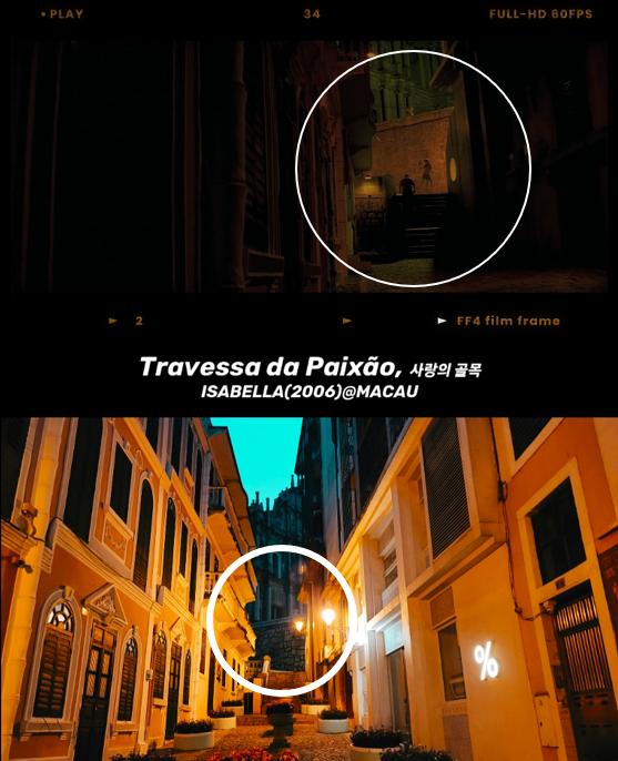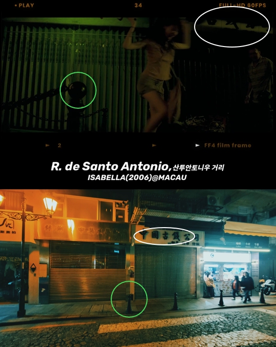- 현장메모: 관광 명소로 탈바꿈 한 곳으로 낯이건 밤이건 활기가 가득했다. 옛 홍등가 시절에는 여성들이 저 발코니에 서서 손님을 이끌었다고 한다. 왕가위 감독의 <2046>과 <에로스>가 1950년대의 홍콩의 분위기를 찾을 수 없어 이곳을 선택했다면, <도둑들>은 잠시 스쳐 지나가는 힙스터식 마카오의 표정을 이곳에서 담았다. 그에 비해 <이사벨라>는 이 공간의 정체성과 역사를 정면으로 받아들이며 마카오라는 도시의 시간감각과 감정의 레이어를 가장 깊이 있게 드러낸 영화로 보인다.