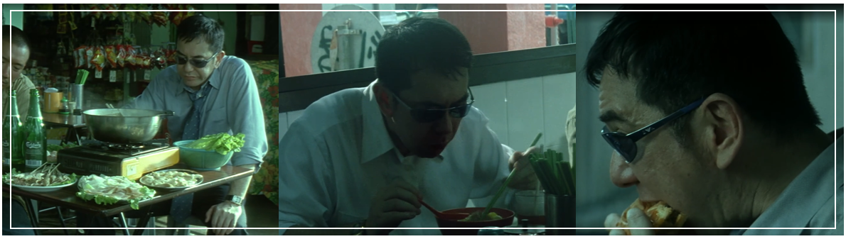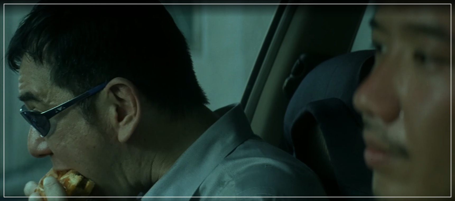 - 특징: 상로렌소거리는 16세기 포르투갈의 임차지로 시작해 시간이 흐르며 유럽과 중국의 문화가 뒤섞인 공간으로 변했다. 성당(신앙)과 살레시아노(교육) 사이, 황추생의 차는 두 시대의 틈에 서 있다. 그의 먹는 행위는 단순한 식욕이 아니라 변혁의 시대를 앞둔 끝자락에 남은 기성세대의 무감한 관성처럼 일상적인 것으로 보인다. 다만 영화 속 세 번의 먹방 중 싱을 걱정해 주는, 그나마 상사다운 대사를 건네는 장면이어 특별하다.