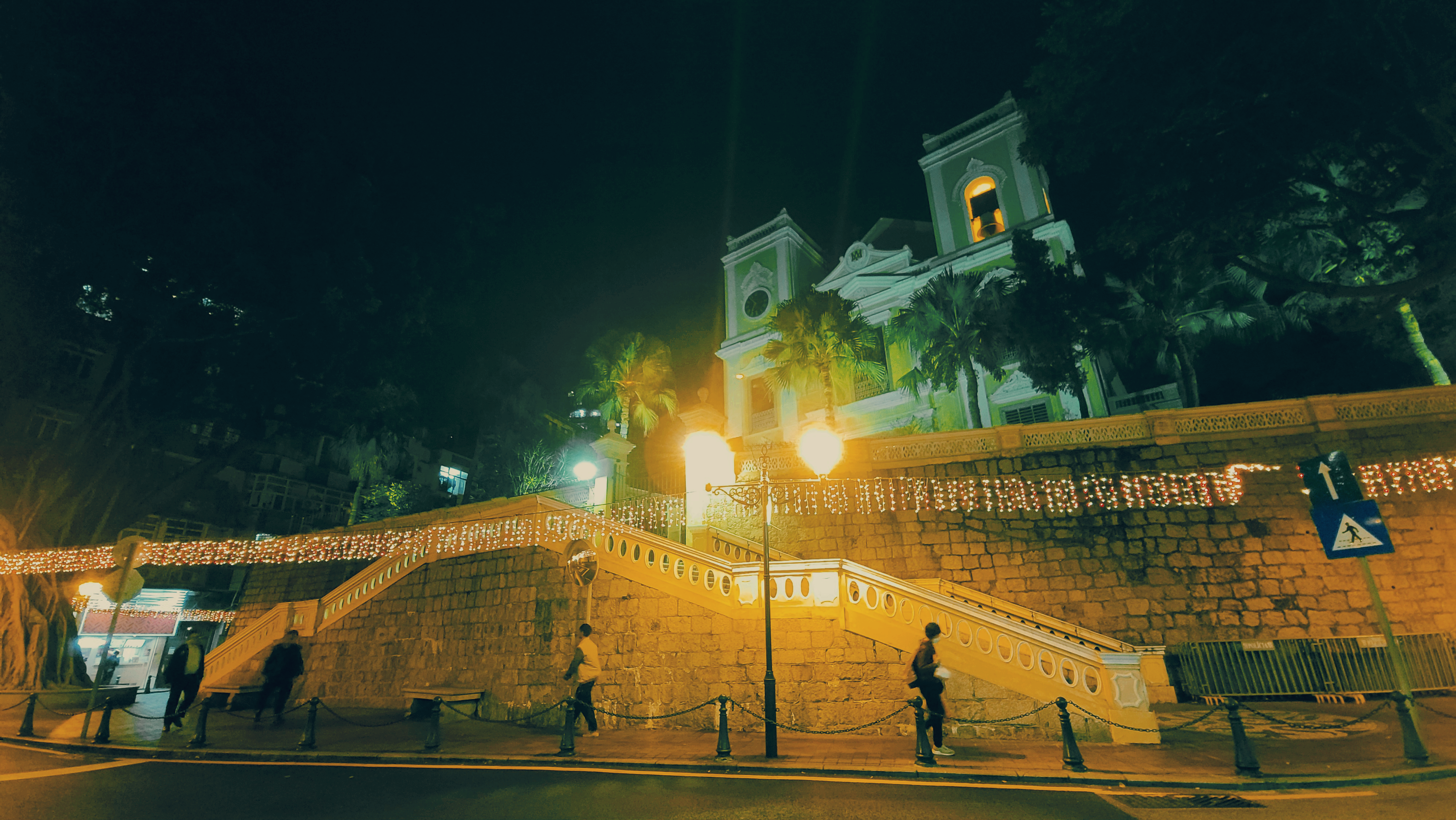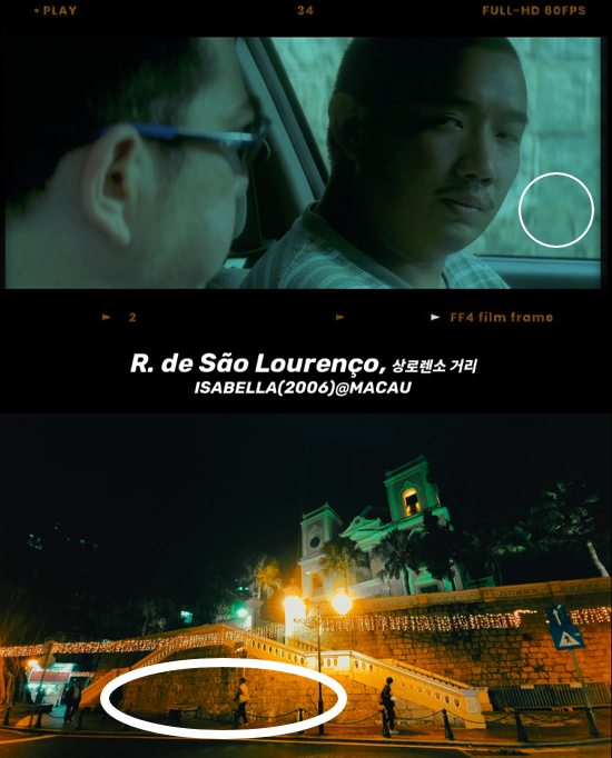 - 현장메모: 상로렌소 성당은 바다를 향한 '풍순당(風順堂) - 순풍을 기원하는 예배당'이라 불리며 출항하는 선원들의 가족들이 안전한 항해와 무사 귀환을 빌던 공간이었다. 영화 속 지금은 간척을 통해 바다는 멀어지고 그 자리를 도시의 일상과 타협의 대화가 대신한다. 감독은 성당을 보여주지 않음으로써 옛 기도의 자리 아래에서 오해와 현실이 맞부딪히는 인간의 풍경을 남겼다. 계단 위엔 바다로 향한 기도의 기억이, 계단 아래엔 그 기억을 잊은 도시의 시간이 흘러간다. 영화 이사벨라는 마카오라는 공간과 역사와 문화를 알면 알수록 그 깊이를 더해가는데, 이곳에 와보고서야 살레시아노 학교가 건너편 상로렌소 성당이 있음을 발견하고 도시 자체를 미장센으로 다루고 있었다는 점에 감탄했다.