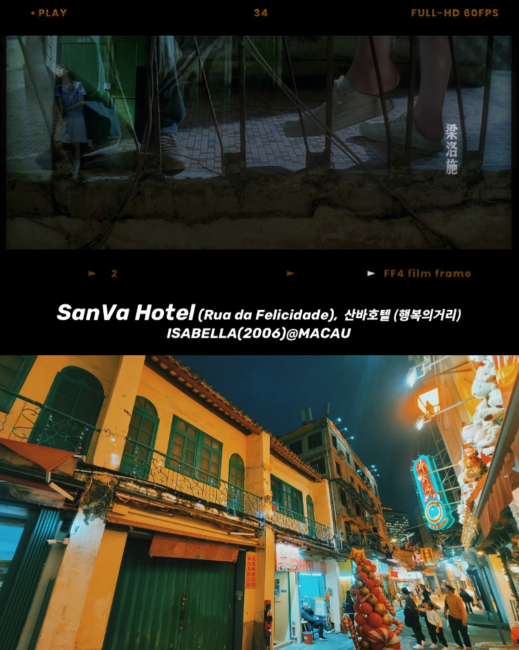 - 특징: Rua da Felicidade - 이름은 행복의 거리지만 그 역사는 오래된 홍등가의 기억으로 짙게 물들어 있다. 이 거리는 한때 쾌락과 생존이 뒤섞인 마카오의 밤을 상징했다. 그 중심에서 140년 넘게 자리를 지켜온 산바호텔은 말 그대로 이 거리의 터줏대감이다. 관광지로 단장된 오늘날에도 그 구조와 질감은 크게 변하지 않고 오히려 이 거리가 지닌 유일한 원형에 가깝다고 한다. 숙소라는 본질 때문에 산바호텔은 언제나 '머물다 떠나는 사람들'을 위한 임시 거처다. 그래서 이곳은 늘 '흘러가는 시간의 중간지점'에 서 있으며 영화 이사벨라 속 싱이 머물 공간으로 더없이 자연스러운 선택이었다.