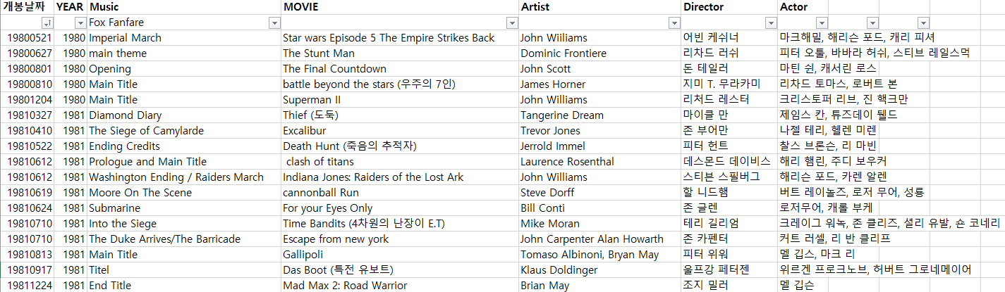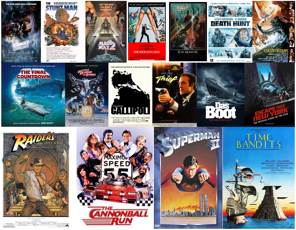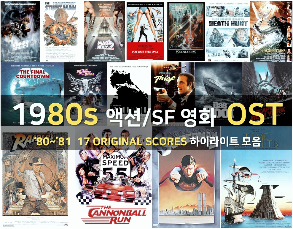 (00:05) 1980 Star Wars: Episode - 5 The Empire Strikes Back (스타워즈 V) - 존 윌리암스 | 디즈니+ (01:14) 1980 The Stunt Man (스턴트 맨) - 도미닉 프롱띠에르 (02:21) 1980 The Final Countdown (최후의 카운트다운) - 존 스콧 | 왓챠, 웨이브 (04:00) 1980 Battle Beyond the Stars (우주의 7인) - 제임스 어너 (05:15) 1980 Superman II (슈퍼맨 2) - 존 윌리암스 |웨이브 (06:35) 1981 Thief (도둑) - 텐져린드림 (07:36) 1981 Excalibur (엑스칼리버) - 트레버 존스 (08:39) 1981 Death Hunt (죽음의 추적자) - 제롤드 임멜 (09:29) 1981 Clash of Titans (타이탄족의 최후) - 로렌스 로젠탈 | 넷플릭스, 웨이브 (10:58) 1981 Indiana Jones: Raiders of the Lost Ark (인디아나 존스 레이더스) - 존 윌리암스 (12:11) 1981 Cannonball Run (캐논볼) - 스티브 돌프 | 왓챠, 웨이브, 티빙 (12:29) 1981 Cannonball Run (캐논볼) - 스티브 돌프 |왓챠, 웨이브, 티빙 (13:04) 1981 For your Eyes Only (007 포 유어 아이즈 온리) - 빌 콘티 | 웨이브 (14:35) 1981 Time Bandits (4차원의 난장이 E.T) - 마이크 모란 | 웨이브 (16:17) 1981 Escape from new york (이스케이프 프롬 뉴욕) - 존 카펜터, 앨런 하워스 | 네이버시리즈온 (17:39) 1981 Gallipoli (갈리폴리) - 토마소 알비노니, 브라이언 메이 (18:55) 1981 Das Boot (특전 유보트) - 클라우스 돌딩어 (19:52) 1981 Mad Max 2: Road Warrior (매드 맥스 2: 로드 워리어) - 브라이언 메이 | 네이버시리즈온