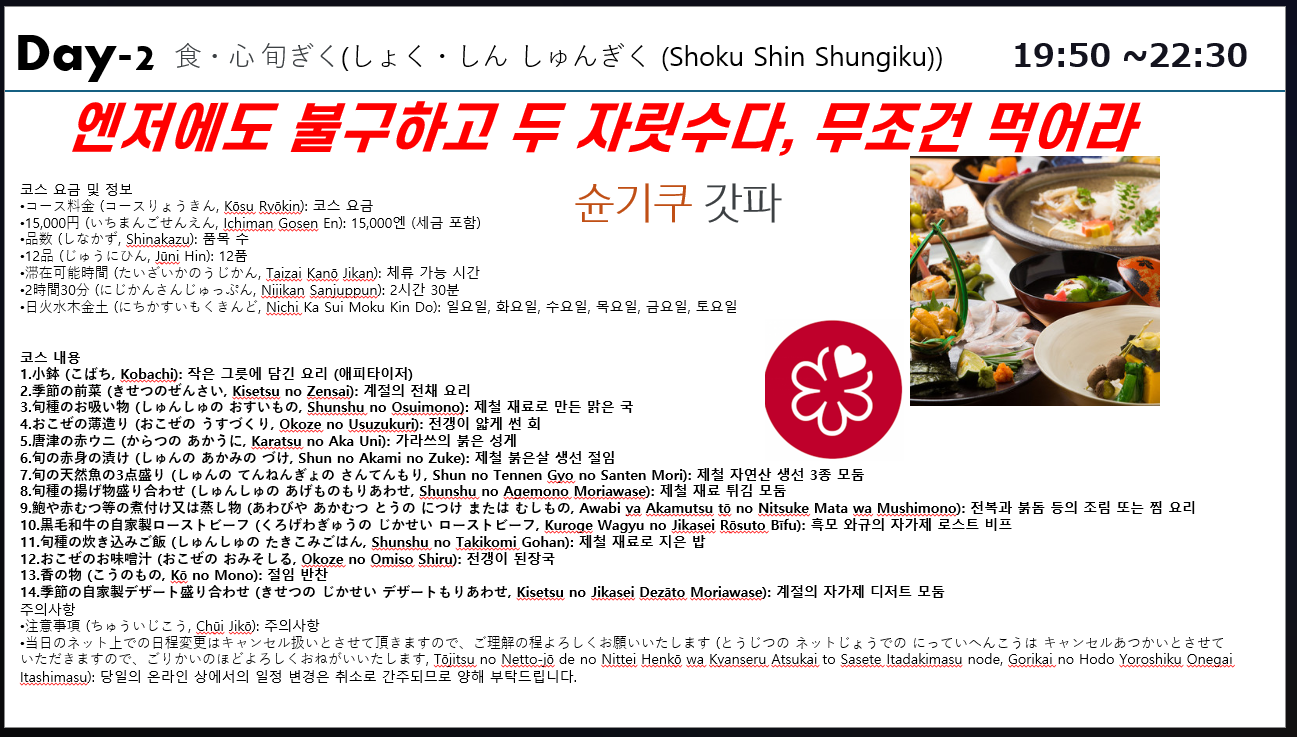 계획:... 코스요리에 1인 예약 가능! 근데, 12품 코스 요리. 아무리 엔저라 하지만 가격이 만만치 않다. 쇼쿠 신 슌기쿠, 기대한다!!! 과연 소식가인 내가 저걸 다 먹을 수 있을까? 나도 궁금하다. 미슐랭 3이라고 하니 맛나지 않을까? 이곳을 클리어하고 정신과 체력이 남아 있다면 나카스 야타이 포장마차 거리를 좀 구경하다가 숙소로 돌아가려 한다...