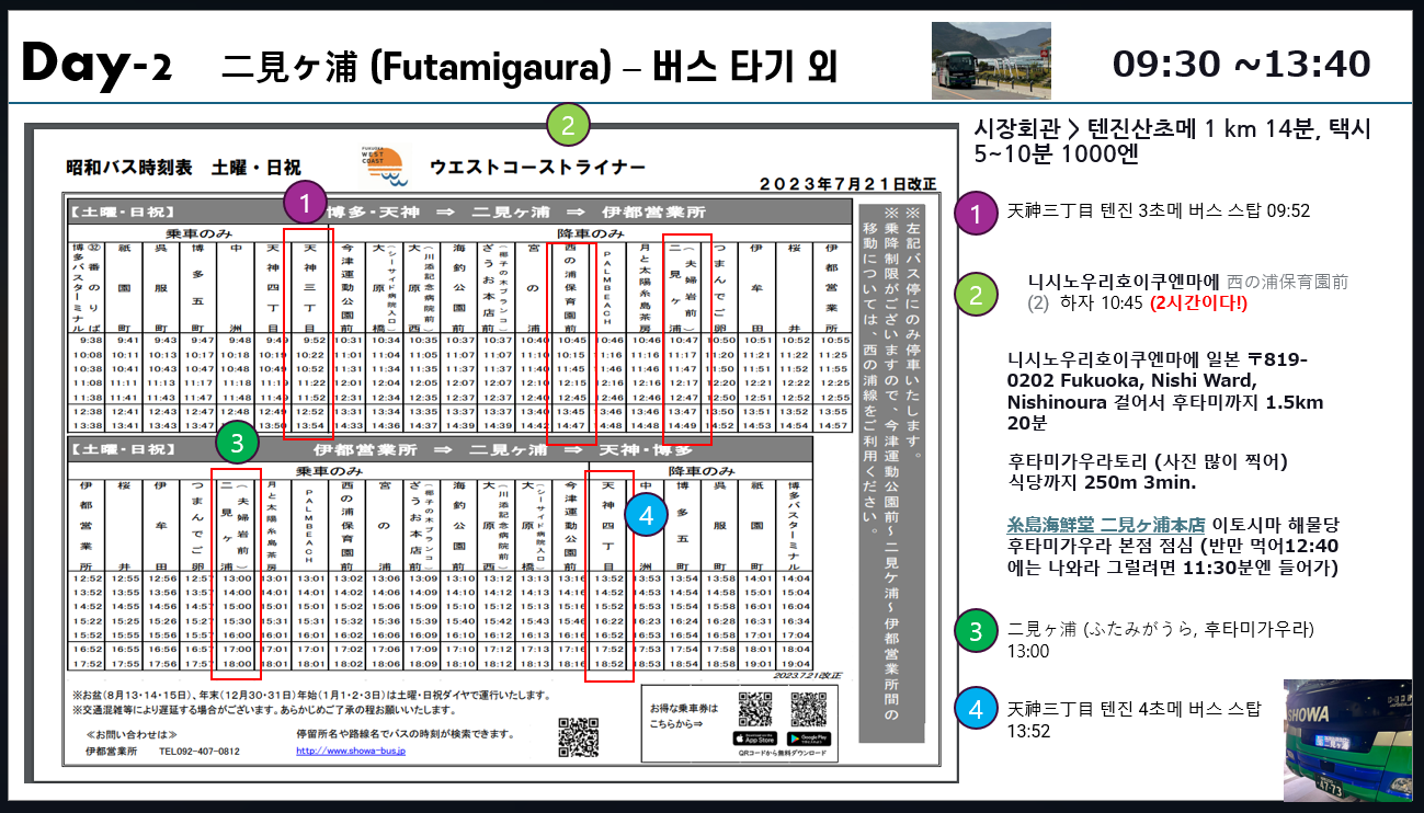 결과> 영화 촬영지 방문과 함께 이번 여행의 핵심 테마였던 이토시마에 있는 후타미가우라 방문 시간이다. 아침 먹고 나오니 약 8시. 배도 괜찮고 시간도 좀 남고 비도 멎고 아주 푸르른 하늘이 펼쳐져서 설설 걸어서 3번가 버스 정류장까지 걸어갔는데 웬걸? 웹검색 봤을 땐 항상 버스 시간표가 표지판에 꽂혀 있었는데.... 보니까 "없다." (주말과 평일의 스케줄이 다르기 때문에, 간 날은 또 토요일이라 잘 꽂아 넣어져 있겠지 생각했는데...)