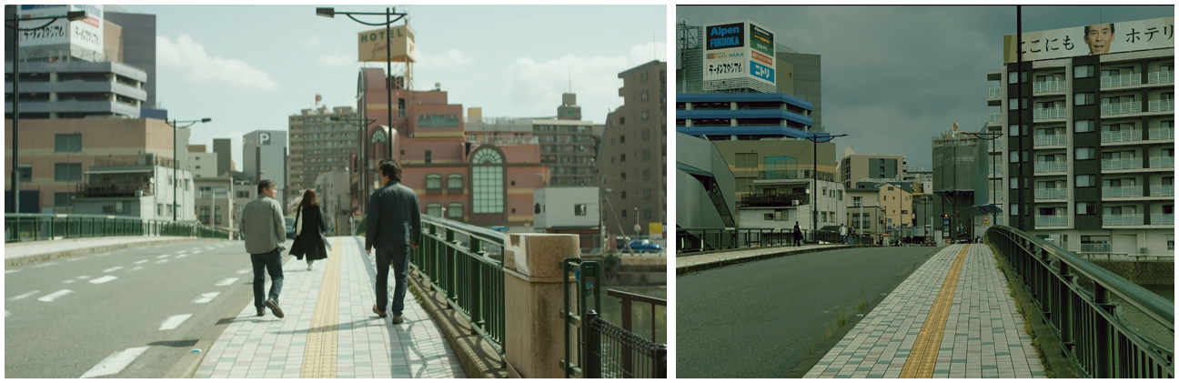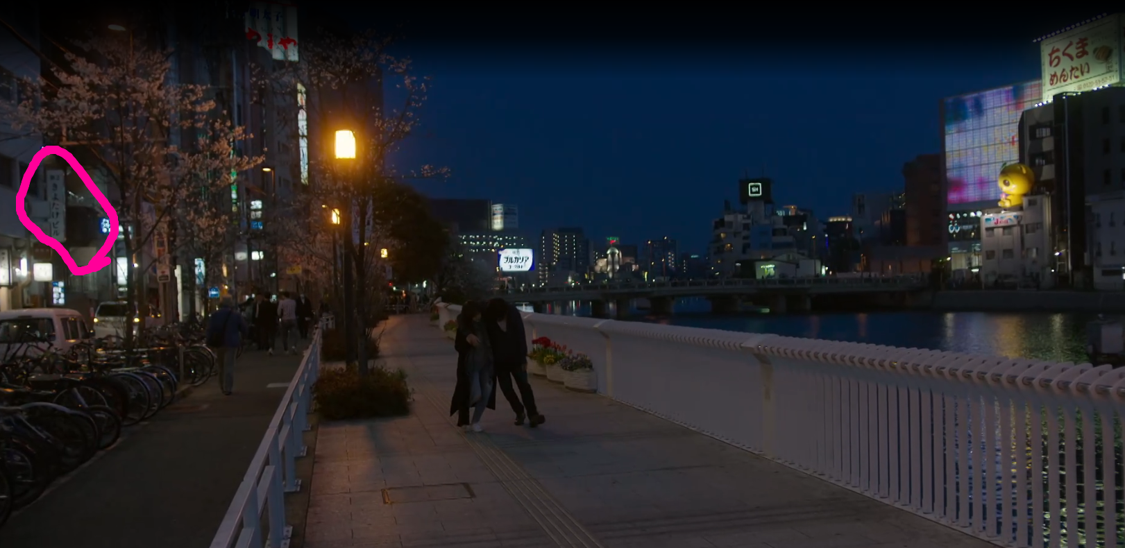 소담이 중국여성과 대화를 끝내고 셋이 같이 넘어가는 나다노카와 다리도 찍었다. 전체적으로 느낀 건데 영화가 4년 전 (2020년) 영화긴 한데 도시 군데군데 풍경이 많이 바뀌어 있는 것을 확인할 수 있었다. 그러니까 건물이 아예 통재로 날아가고 새 건물이 있는 그런... 여기도 그렇다. 좌측 주차장으로 보이는 건물이 회색에서 파란색으로 페인팅이 바뀐 것은 그렇다고 쳐도 좌측은 아예 새로운 건물이 들어서 있다