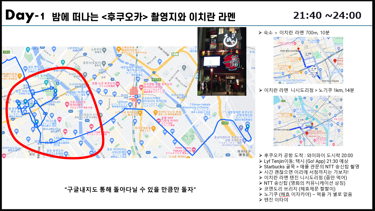 결과> 하카타 멘타이쥬에서 밥을 먹고 나와 시간이 좀 남아서 걷다가 우읭? 하며 또 촬영지 스폿 발견. 비가 꽤나 내리는 날이었지만 또 강행군을 한다.